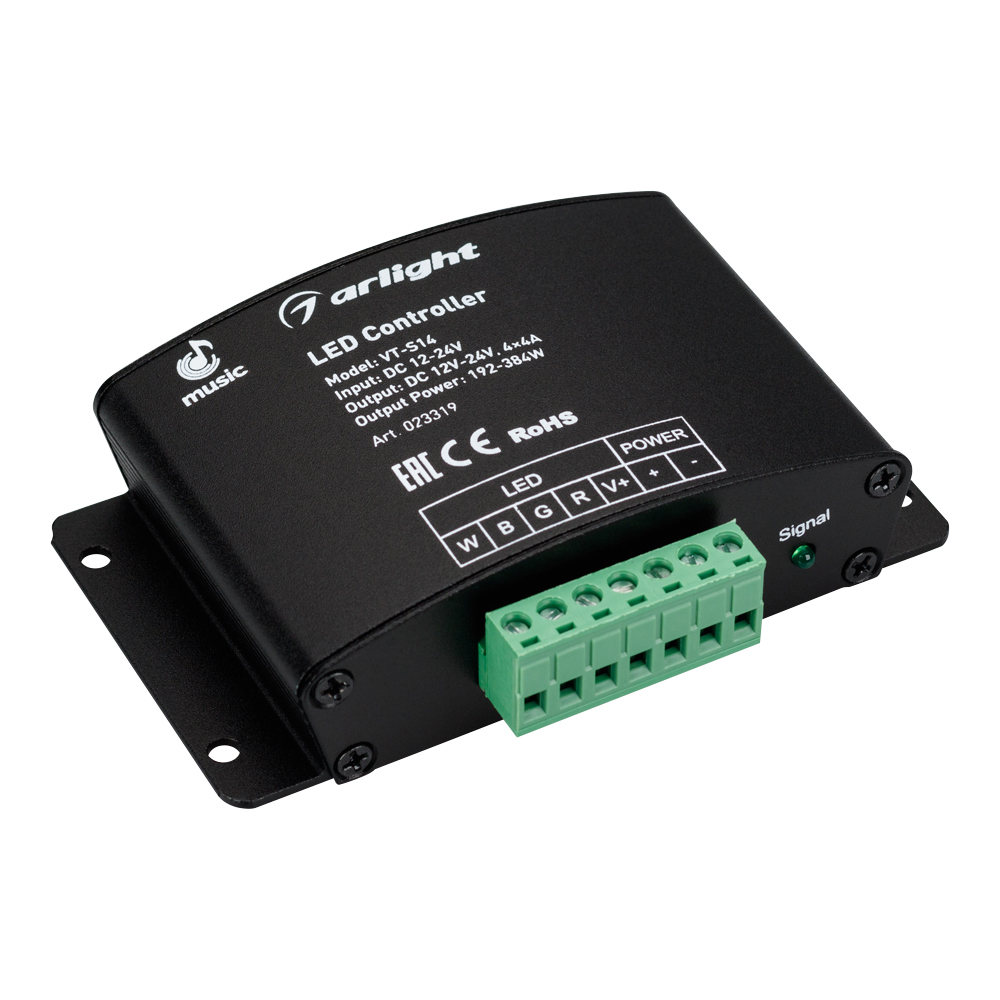 RGBW-АУДИОконтроллер с RF ДУ (24 кнопки), рег-ка яркости, цветности, скорости, 3 аудиорежима. Вход аудио и внешнего микрофона, регулировка усиления. Выход 12-24V 192-384W, 4х4A. Габариты 108х63х28 мм. Вместо 019938.