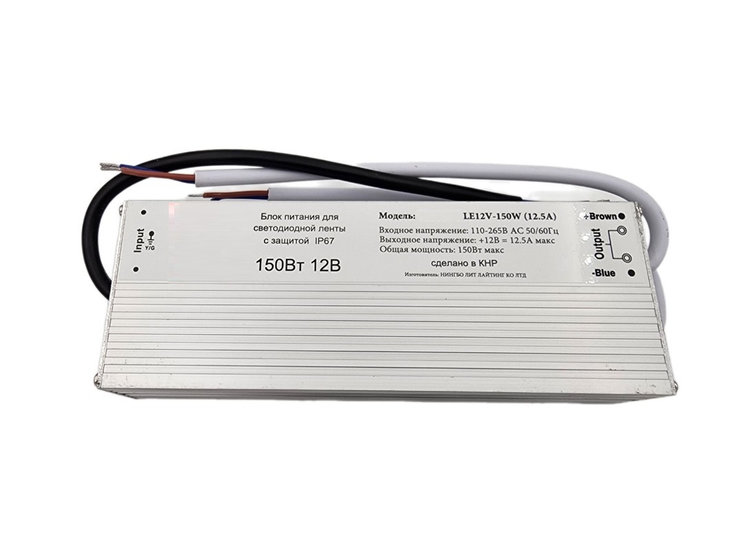 Блок питания эконом класса, модель LEDIP12V-150W (12.5A), для светодиодных изделий. Алюминиевый герметичный корпус, размеры 207x66x34мм, степень защиты оболочки IP67. Входное переменное напряжение 110-265В, выходное постоянное напряжение 12В. Мощность блока питания 150Вт 12.5А. Гарантийный срок 1 год. Произведено в Китае, поставщик LED-TED.