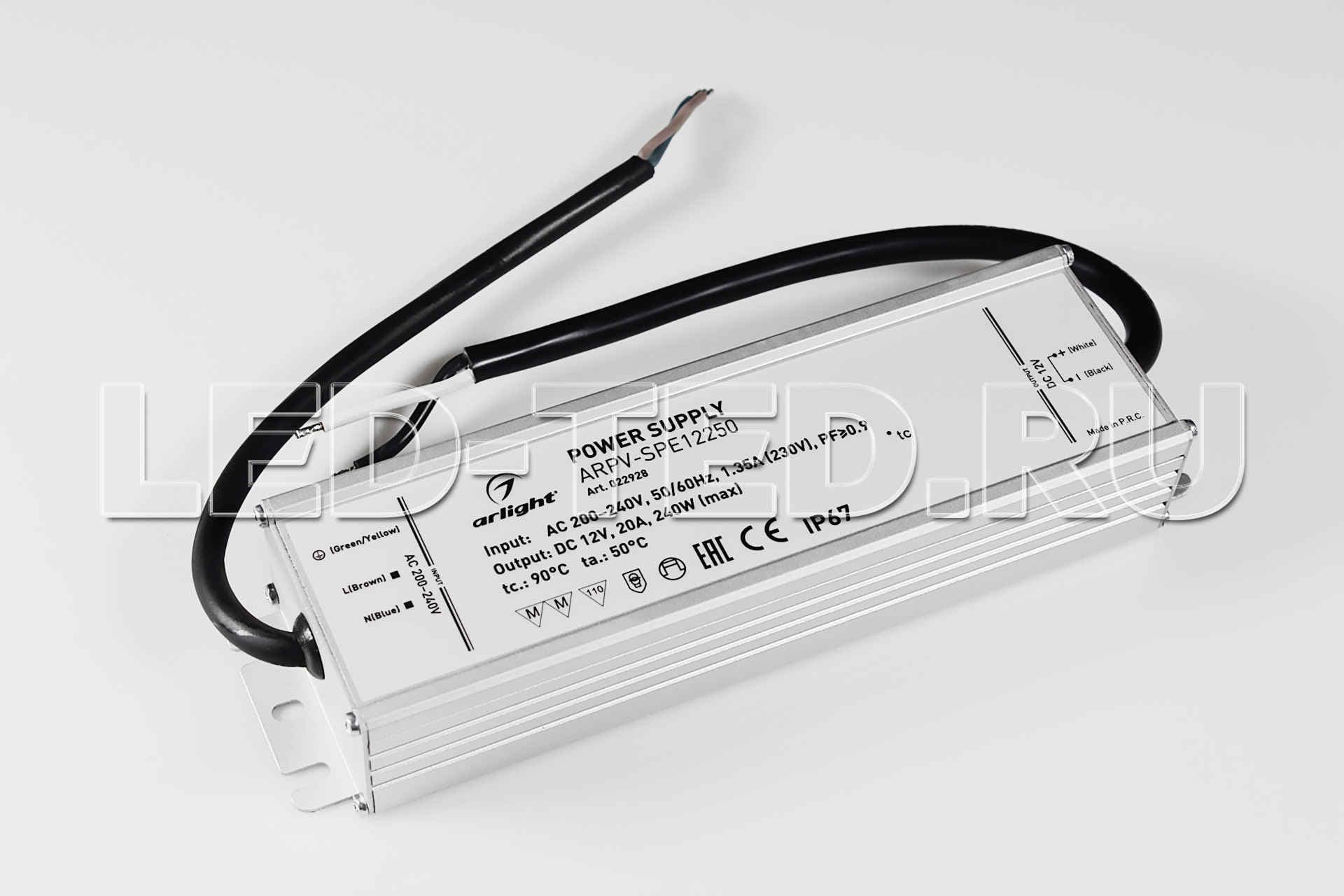Блок питания 12V с гальванической развязкой, ток 20А, 240Вт, герметичный, для светодиодных изделий. Алюминиевый корпус IP67. Совместимость со стандартом EMC. Габариты L221xW61xH36 mm. Вход. напряж-е 200-240V AC, выход 12V DC +-3%, коэффициент мощности PF>0,9. Диапазон раб. темп. -40..+50 С. Гарантия 5 лет 022928