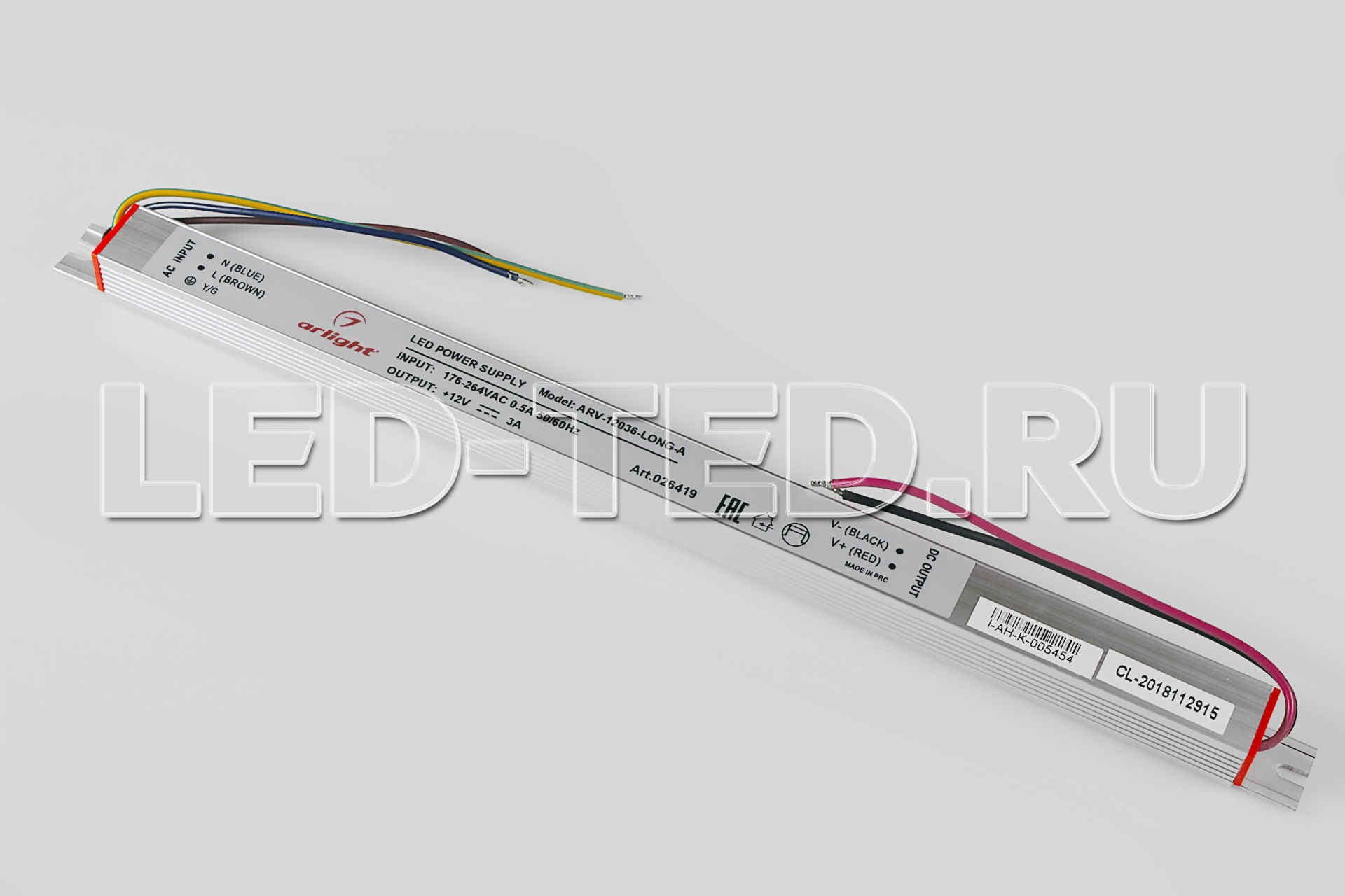 —Блок питания ARV-12036-LONG-A 12V 3A 36W открытый импульсный узкий 026419 Arlight