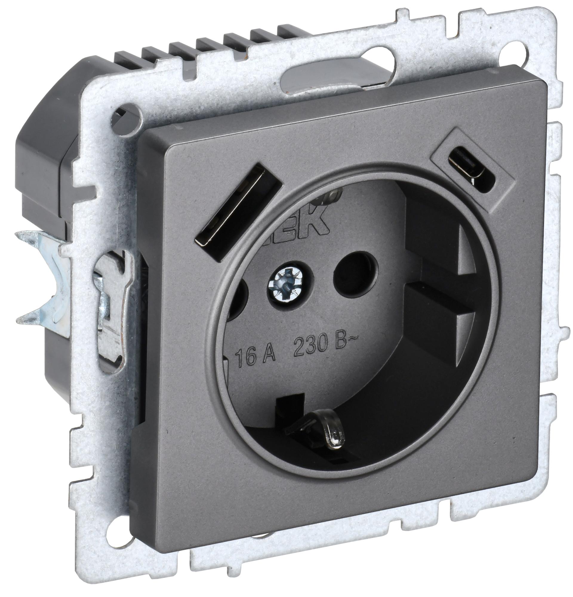 BRITE Роз. с з/к/ш 16А с USB A+C 18Вт РЮш11-1-БрС сталь IEK