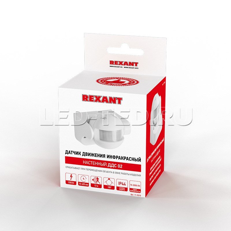 —Датчик движения настенный ДДС 02 180° 1200Вт 10-2000 Лк 12 м 10-420 сек. IP44 REXANT