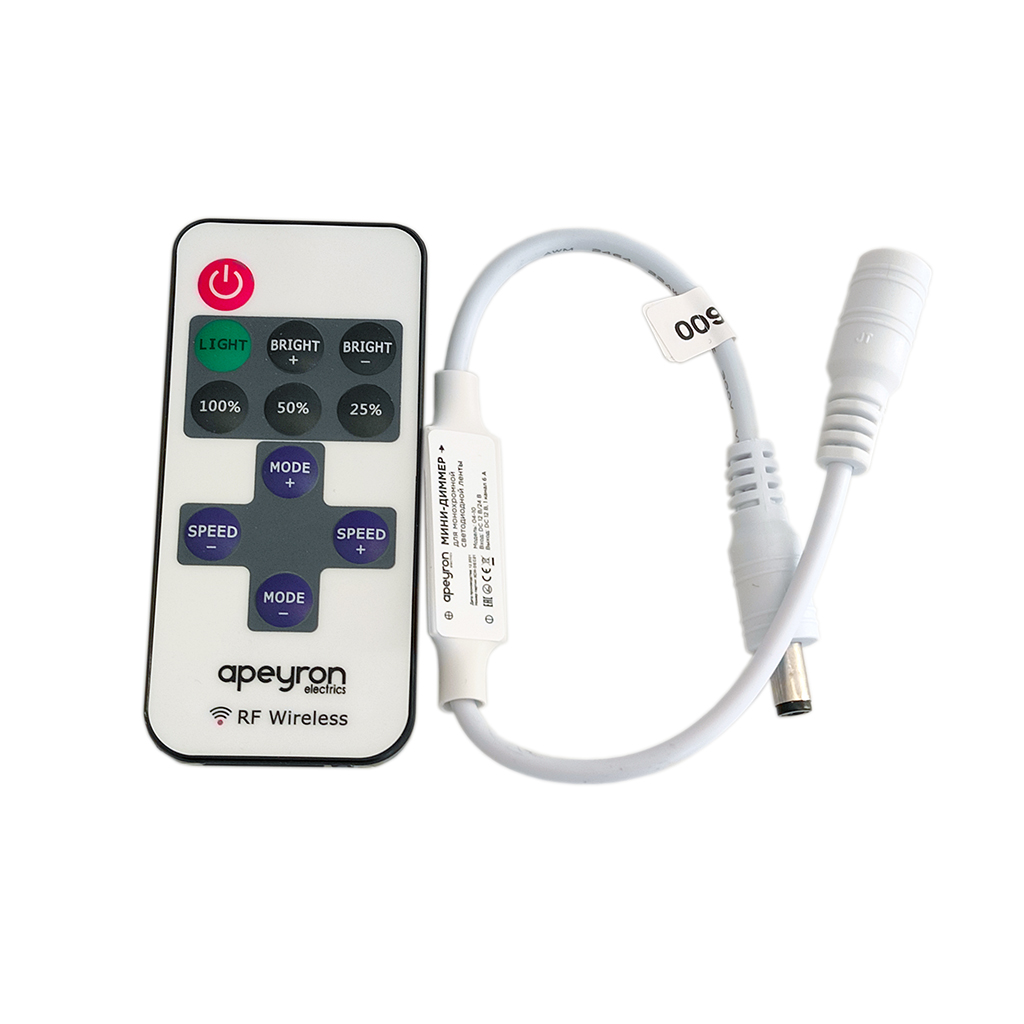 Напряжение 12/24В / Мощность 72/144Вт / Макс. ток 6A / Кол-во вых. каналов 1 / RF пульт 11 кнопок / Функция памяти последнего режима / 8 динамических режимов / Дист. устойчивого управ. 20м / Защита IP20 / Размеры 40х12х5мм.