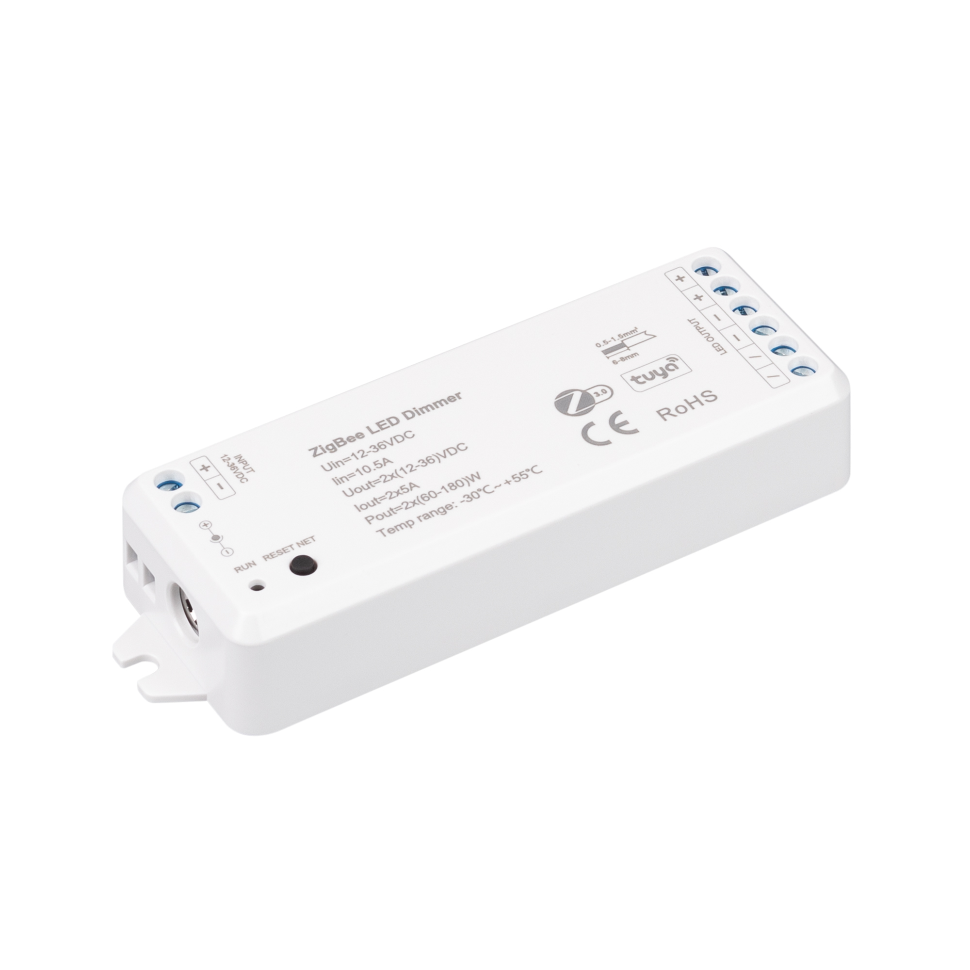Многофункциональный 2-канальный контроллер для светодиодных DIM лент и модулей (ШИМ), интерфейс TUYA (через Tuya ZigBee шлюз), поддерживается управление ЯНДЕКС АЛИСА. Питание/рабочее напряжение 12-36VDC, максимальный ток 5A на канал, 2 канала, максимальная мощность 60-180W. Винтовые клеммы. Корпус - PVC. Габариты 114x38x20 мм. Управляется пультами и панелями серии SMART (поставляются отдельно).