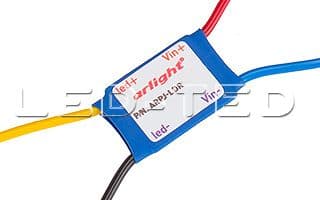 Блок питания для мощных светодиодов (от 1 до 3 шт включенных последовательно). Плата в термоусадочной оболочке. Габариты LxWxH: 25х22х7 мм. Вход 9-12V DC, выход от 3 до (Uпит-1,5) В, 1000 mA, вых. мощность 10,5 Вт (при питании от 12 В) 020412