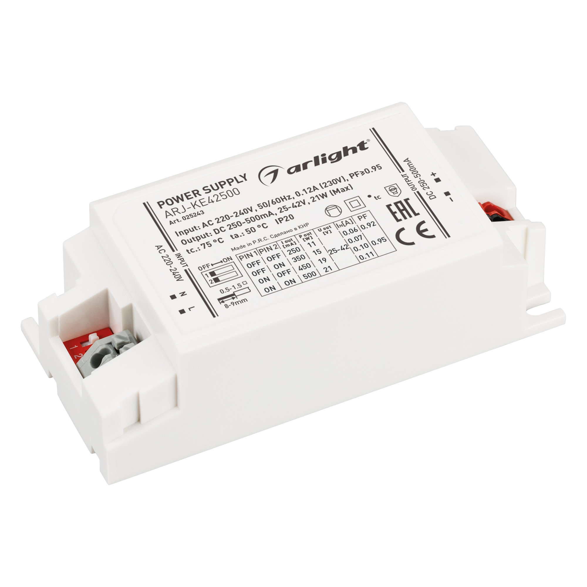 —Драйвер 250-500mA 21Вт 25-42 97х43х31 ARJ-KE42500 21W 250-500mA PFC IP20 Пластик 5 лет