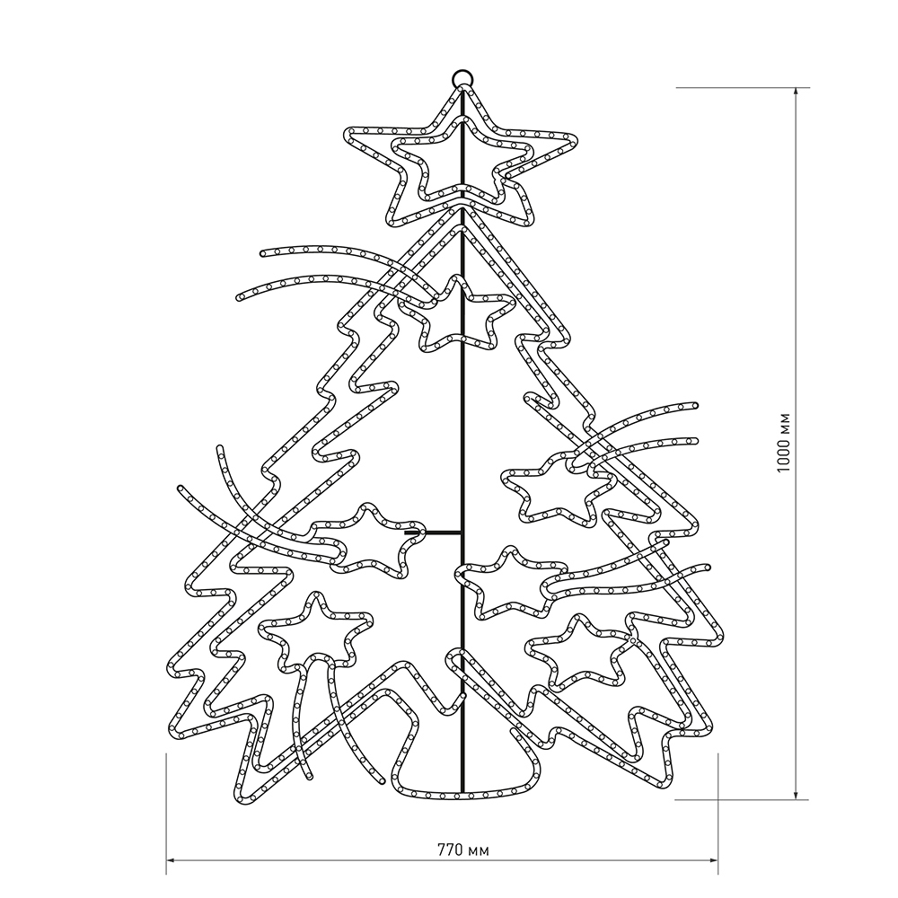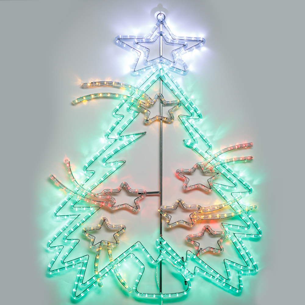 2D фигура из дюралайта "НОВОГОДНЯЯ ЕЛЬ". Напряжение питания AC 230V, потребляемая мощность 361W. Цвет светодиодов ЗЕЛЁНЫЙ/ЖЁЛТЫЙ/КРАСНЫЙ/ТЁПЛЫЙ БЕЛЫЙ, количество светодиодов 648 шт. Габариты 1000x770 мм. Степень пылевлагозащиты IP65. Провод питания (без вилки).