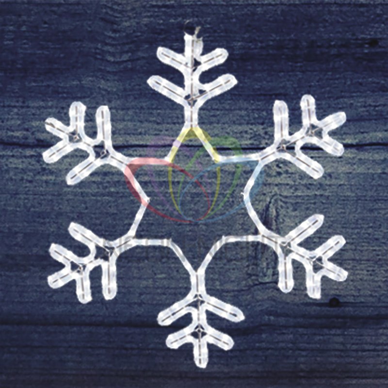Снежинка имеет размер 55*55 см и Белое свечение светодиодов.
