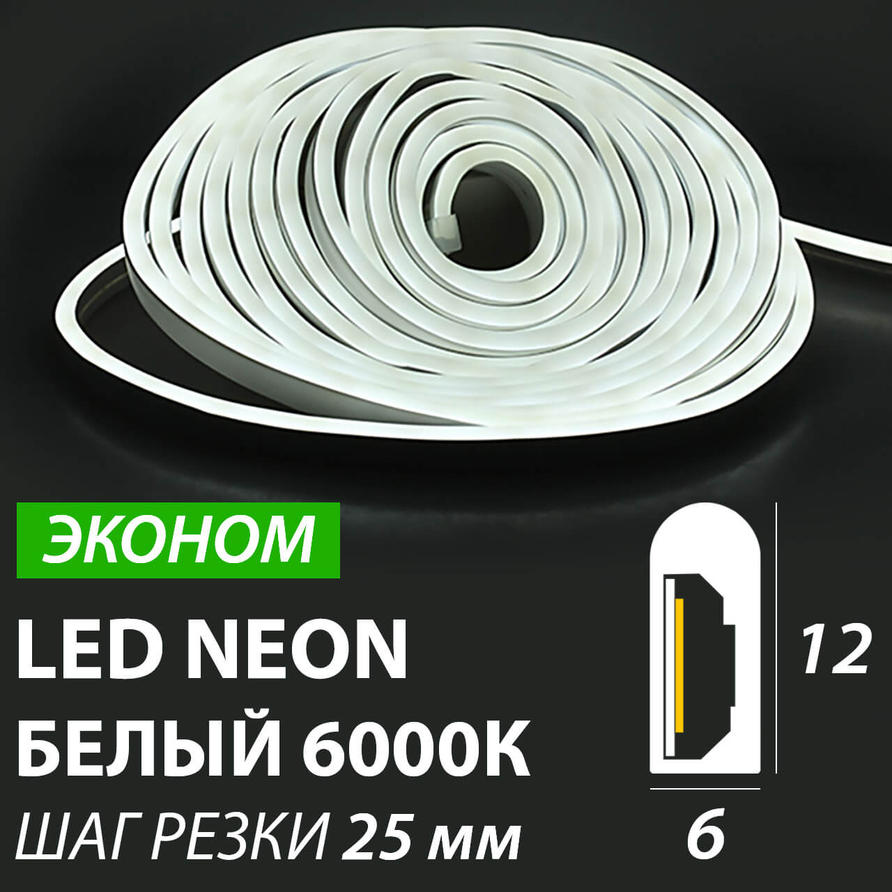 —Гибкий неон 12V 6х12х25мм Белый 6000К 120led/m SMD2835