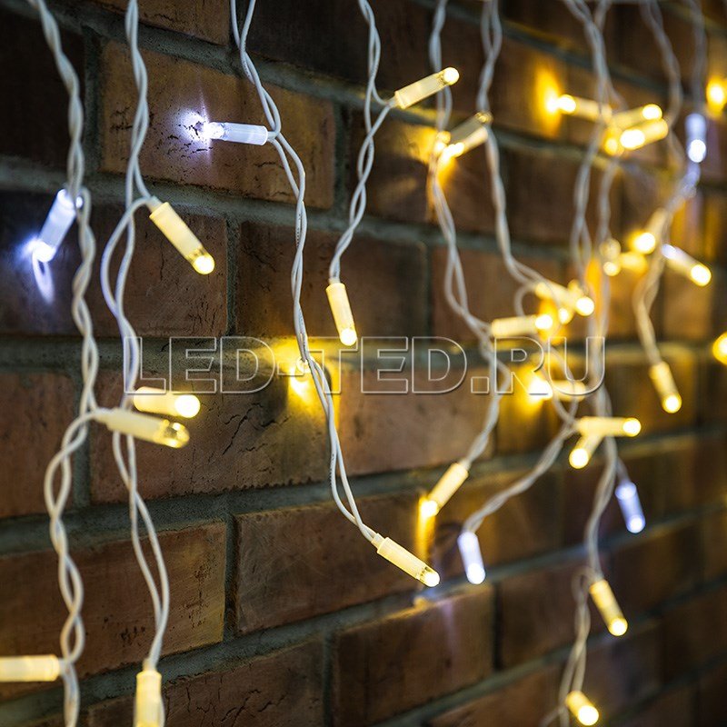 Данная гирлянда имеет Теплый белый цвет свечения. Ее особенностью является наличие мерцающих светодиодов Белого цвета, которые привлекают внимание и значительно преображают украшенную поверхность (мерцает каждый пятый светодиод).