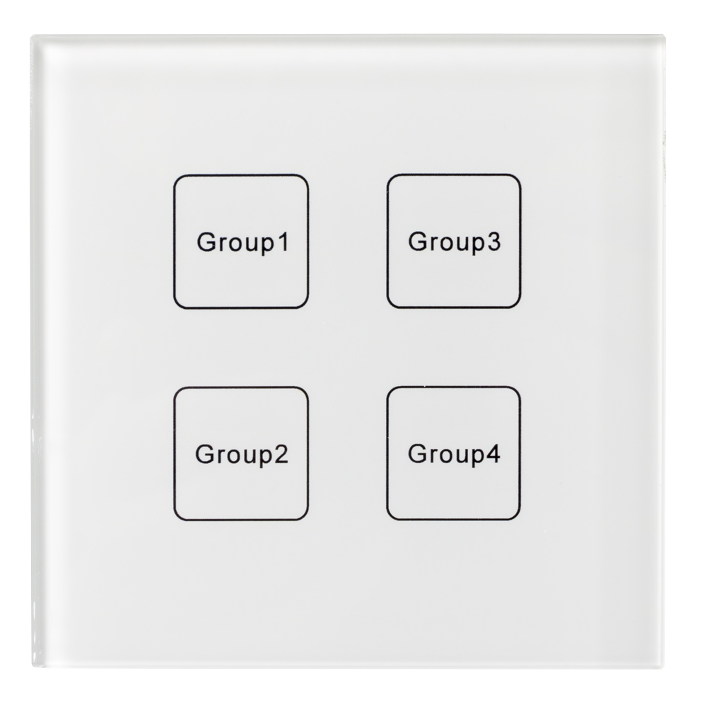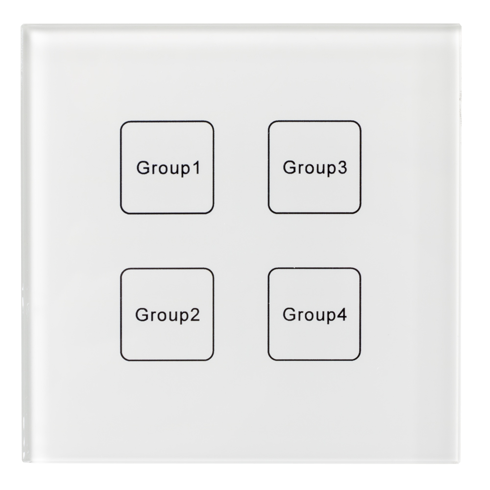 Встраиваемая сенсорная панель с выходом DALI. 4 кнопки, 4 группы. Каждой кнопкой выполняется включение, выключение и диммирование по соответствующей ей группе. Установка стартового номера группы выполняется переключателями на корпусе. Питание от шины DALI (4 мА).