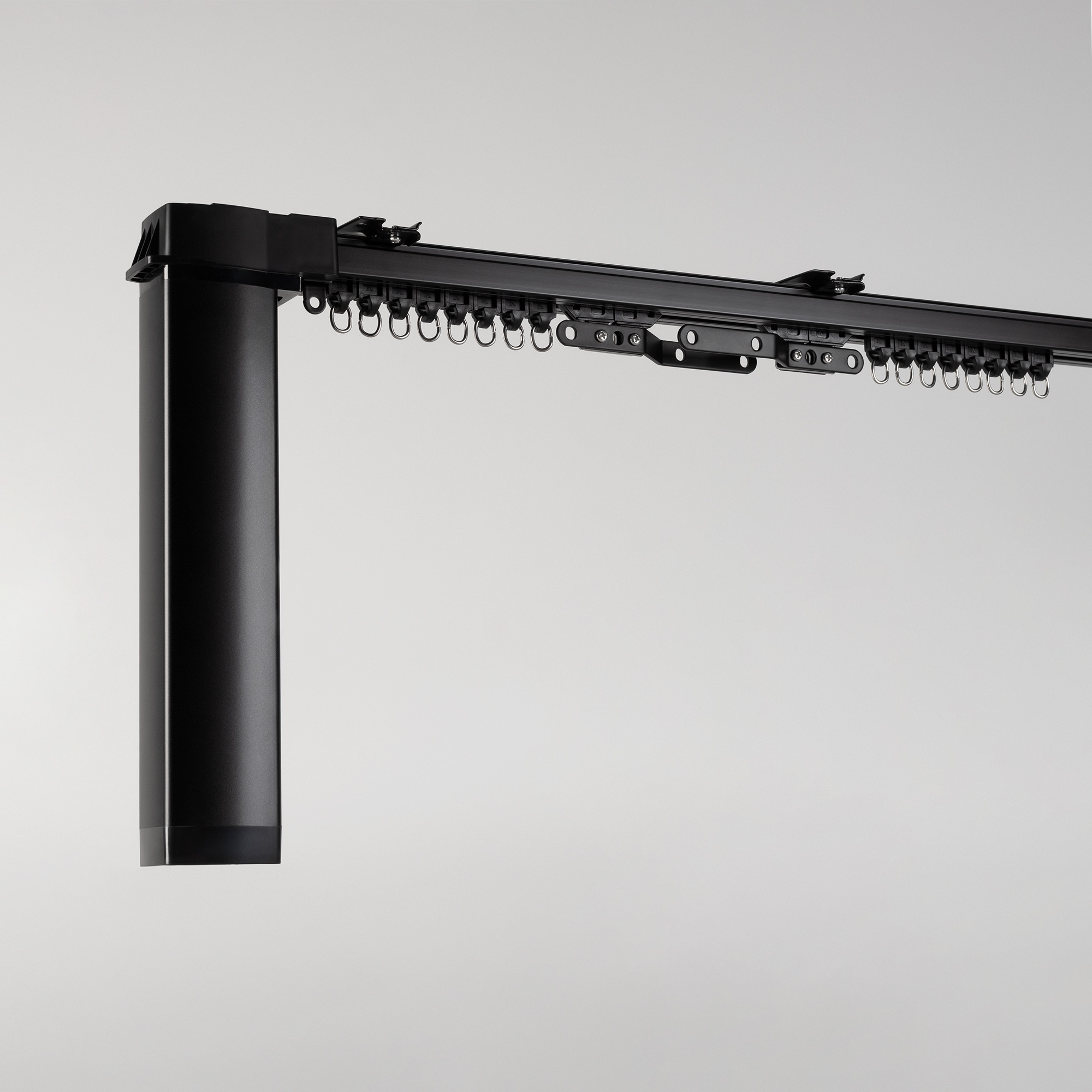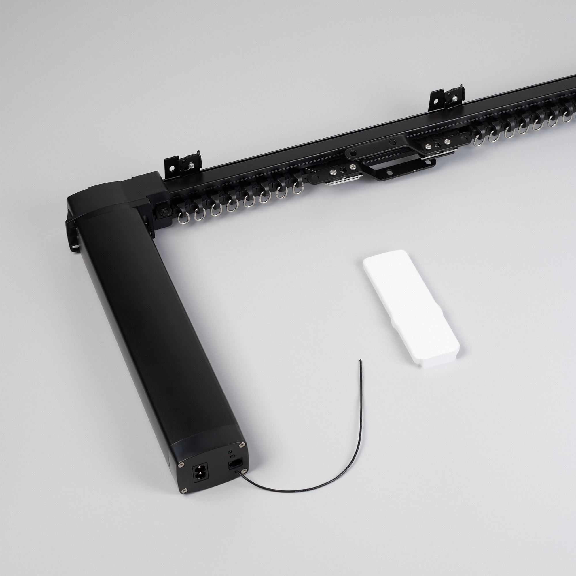 1 мотор, 1 пульт дистанционного управления, алюминиевый профиль 1,6 мм (1м - 1шт, 0.5м - 1шт, 0.2м - 2шт., 0.1м - 1 шт.), 2 соединителя 10 см, 1 соединитель 20 см, 1 переходник 5 см, 2 шкива, 2 пряжки ремня, 2 направляющих бегунка, ремень 4,4 м, 16 бегунков, 2 фиксатора, 4 кронштейна, 1 зажим на ремень