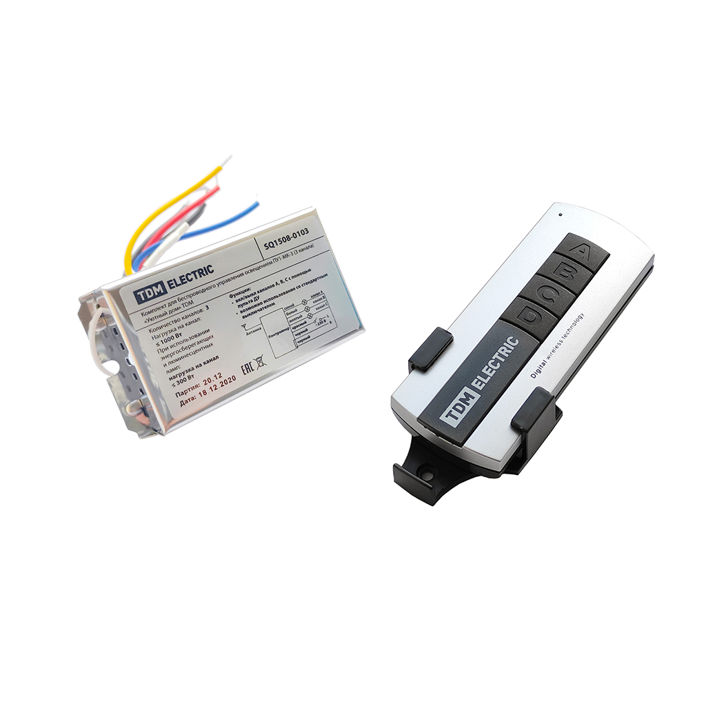 3 канала / Напряжение 230В / Частота сети 50Гц / Частота управления 433,92 МГц / Радиус действия пульта на открытой местности 30м / Мощность на 1 канал: для ламп накаливания 1000Вт; для светодиодных ламп 300ВА / Раб. темп. -15...+55°С / Степень защиты контроллера IР20