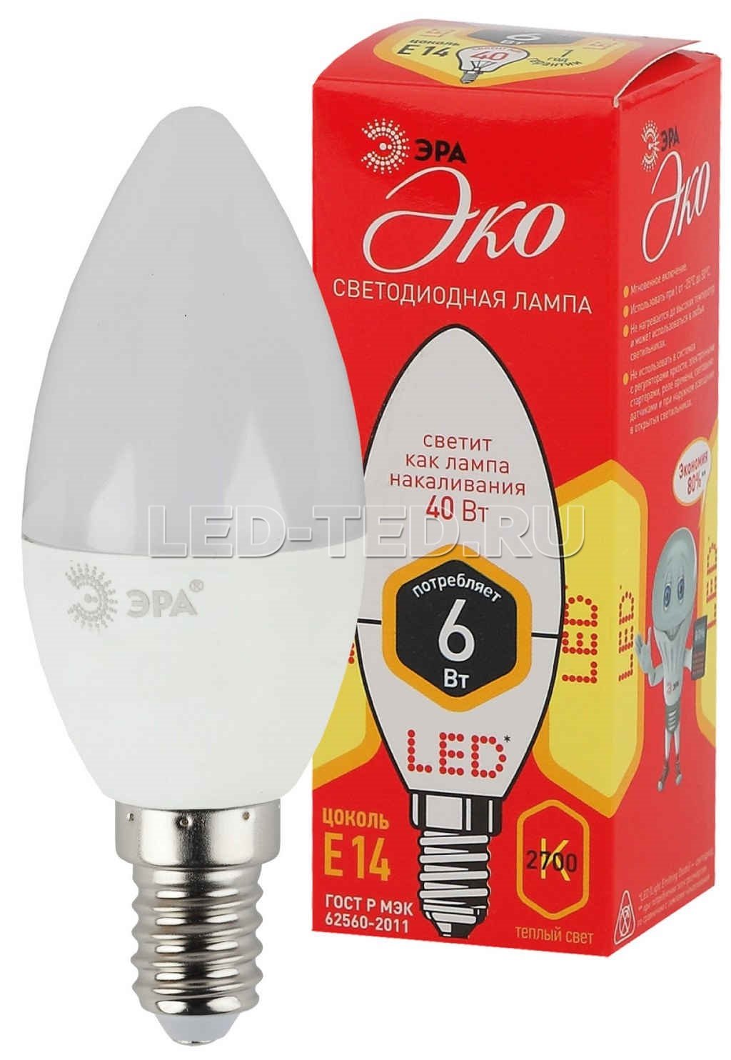 —Лампа E14 ECO LED B35-6W-827-E14 (диод, свеча, 6Вт, тепл, E14)
