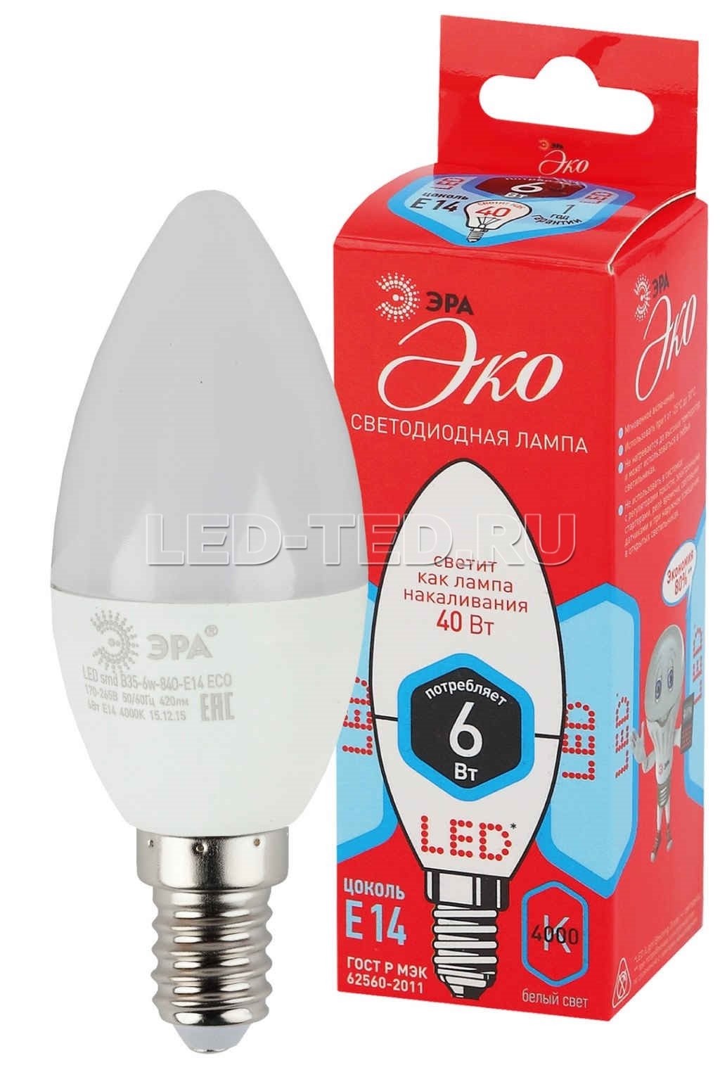 —Лампа E14 ECO LED B35-6W-840-E14 (диод, свеча, 6Вт, нейтр, E14)