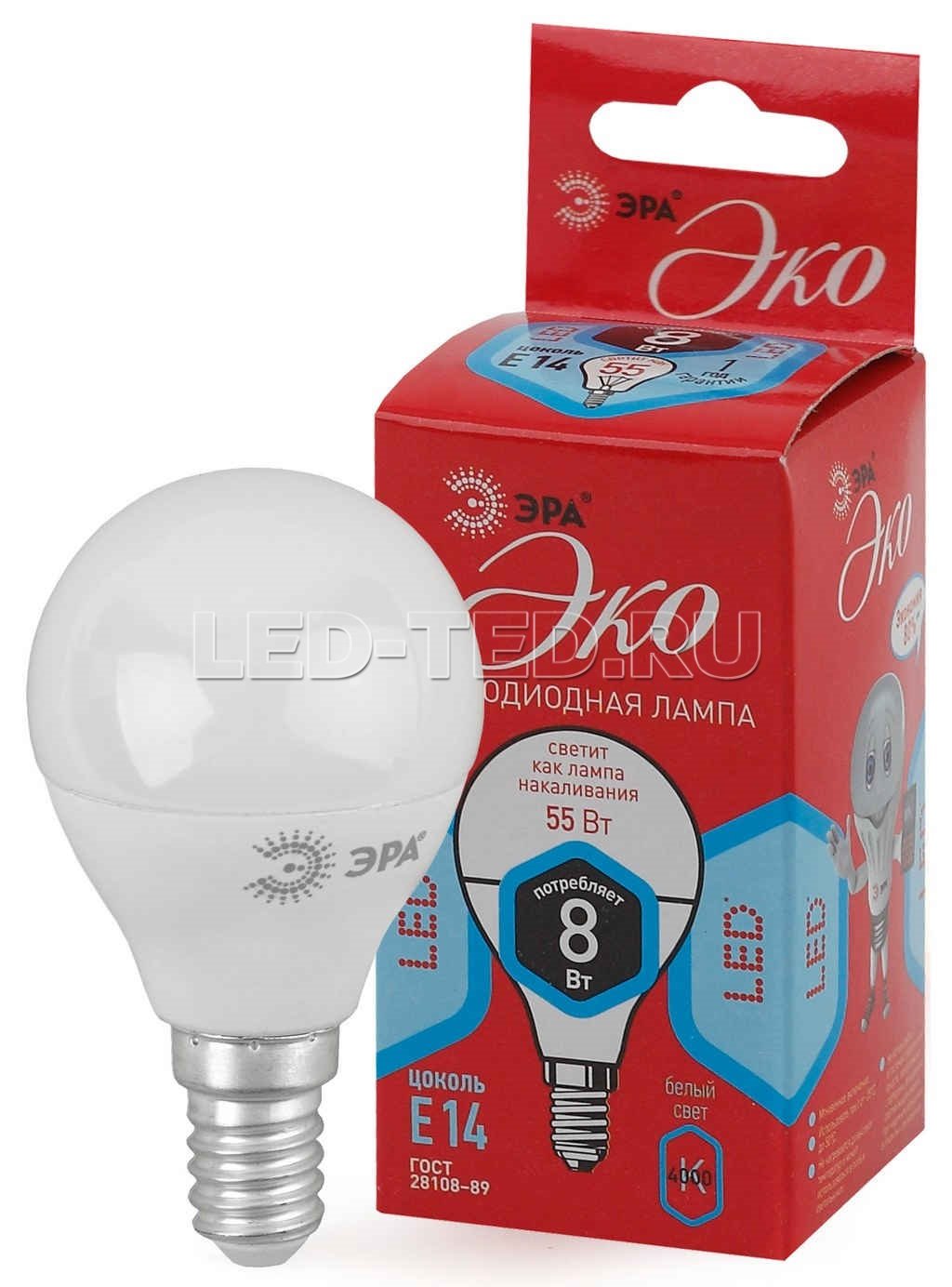 —Лампа E14 ECO LED P45-8W-840-E14 (диод, шар, 8Вт, нейтр, E14) 5055945593648