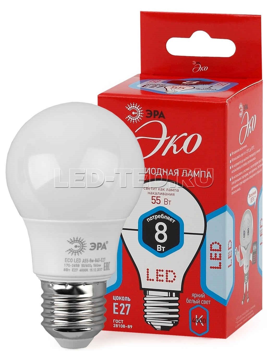 —Лампа E27 ECO LED A55-8W-840-E27 (диод, груша, 8Вт, нейтр, E27)