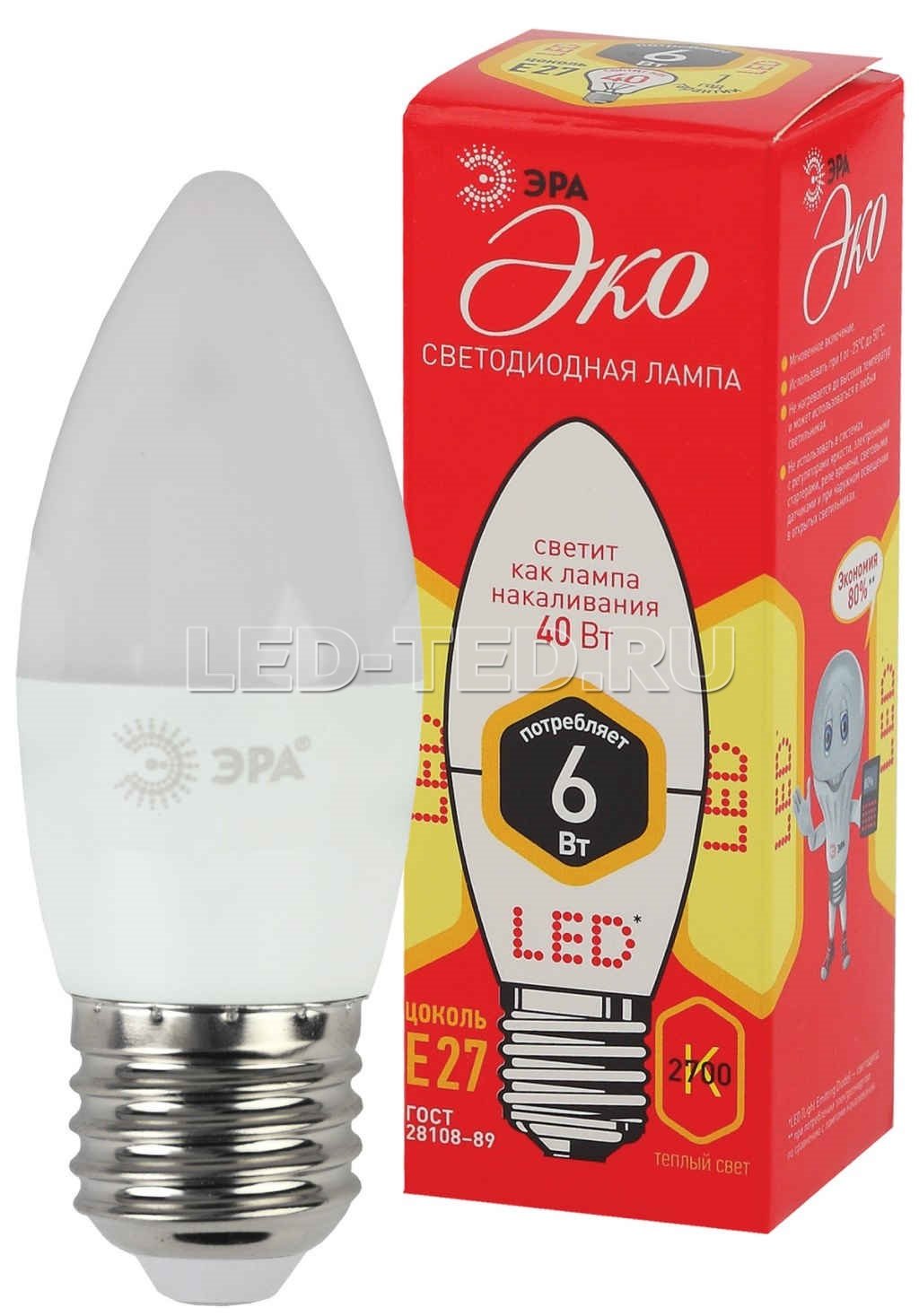 —Лампа E27 ECO LED B35-6W-827-E27 (диод, свеча, 6Вт, тепл, E27) 5055945557077