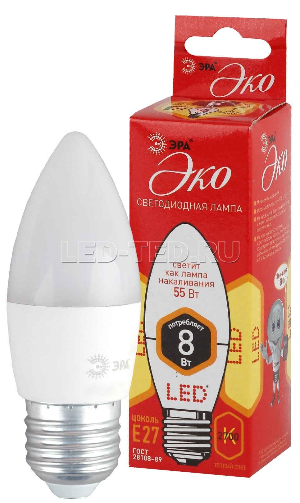 Лампа E27 ECO LED B35-8W-827-E27 (диод, свеча, 8Вт, тепл, E27) 5055945593594