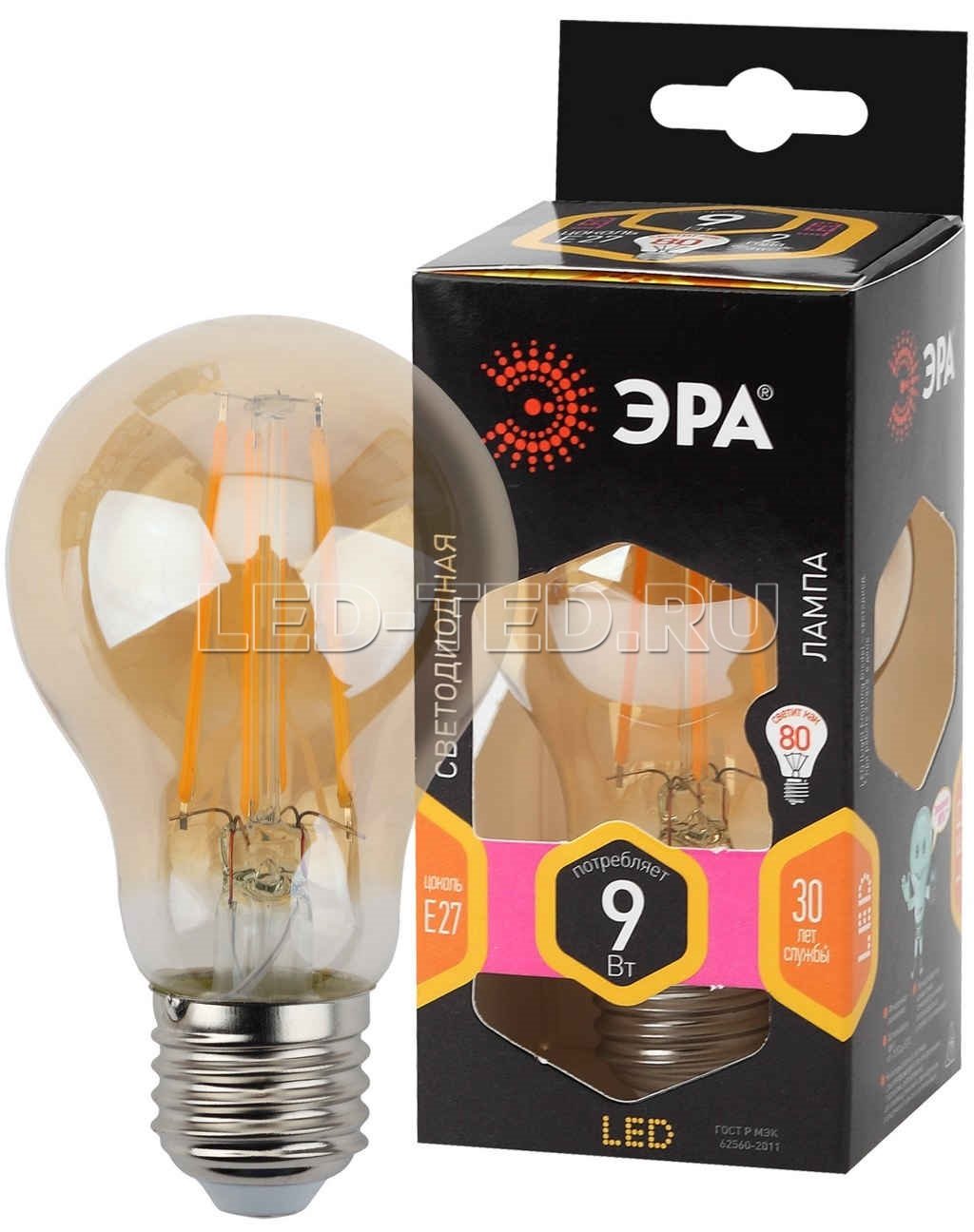 Лампа E27 F-LED A60-9W-827-E27 gold (филамент, груша золот., 9Вт, тепл, E27) 5056183743383