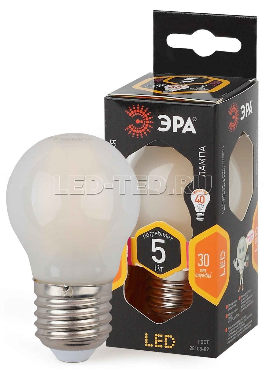 Лампа E27 F-LED P45-5W-827-E27 frost (филамент, шар мат., 5Вт, тепл, E27) 5055945576573