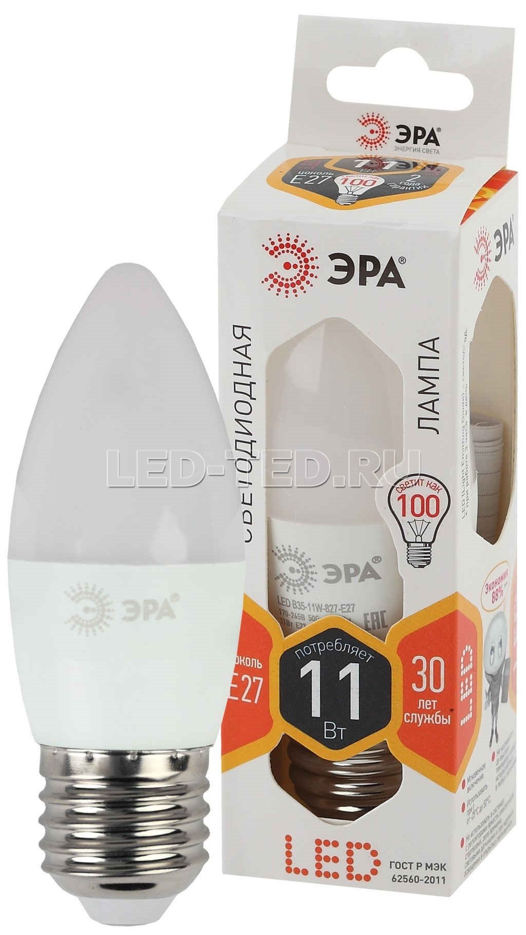 —Лампа E27 LED B35-11W-827-E27 (диод, свеча, 11Вт, тепл, E27) 5056183732332