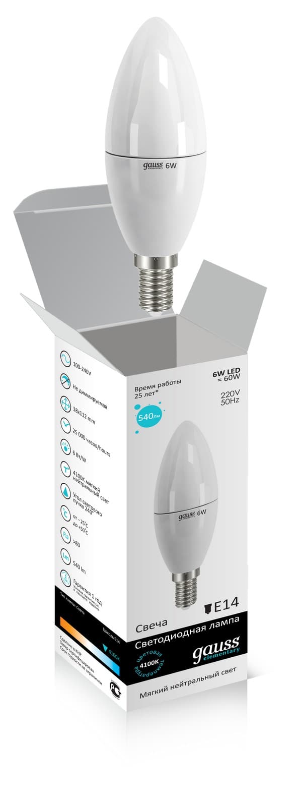 —Лампа Gauss LED Elementary Candle 6W E14 4100K 1/10/100