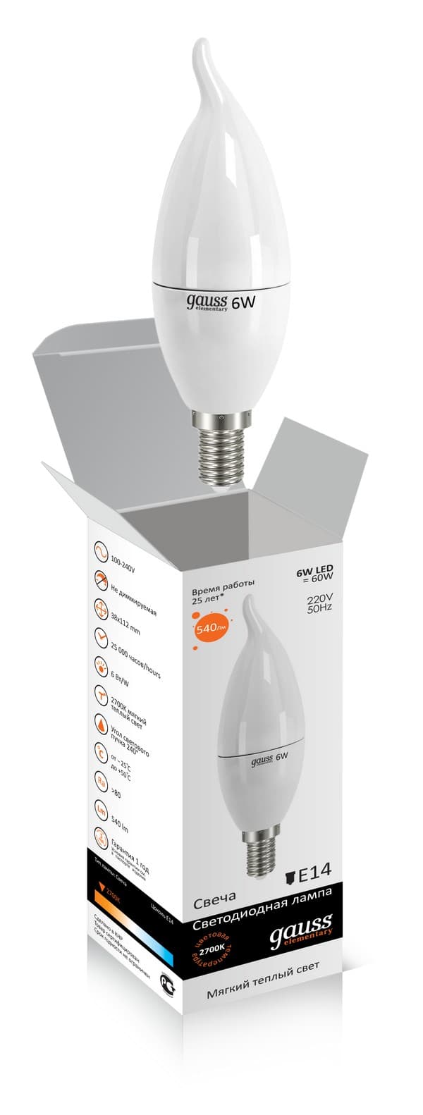 —Лампа Gauss LED Elementary Candle Tailed 6W E14 3000K 1/10/50