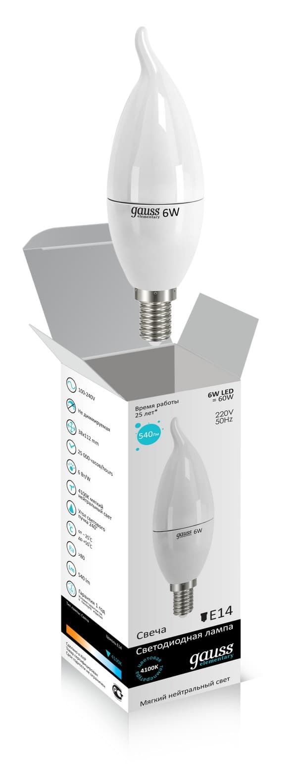 —Лампа Gauss LED Elementary Candle Tailed 6W E14 4100K 1/10/50