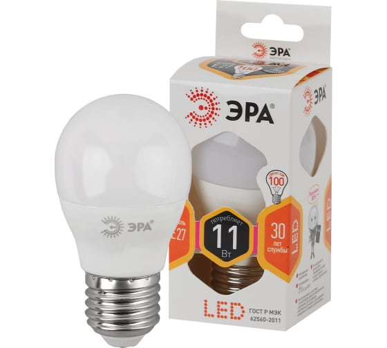 —Лампа Теплая 2700К шар матовый P45-11W-827-E27 5056183732516