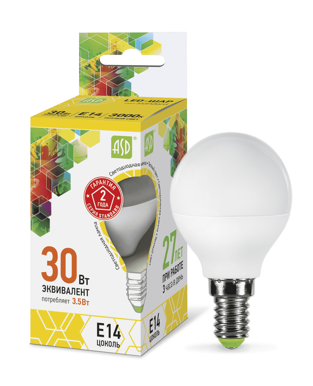 Цоколь:E14 / Мощность:3.5Вт / Эквивалент лампы накал.:30Вт / Цвет. темп.:3000K / Световой поток:320Лм / Напряжение:160-260V / Размеры:45x78мм / Коэфф. пульс.:<5%