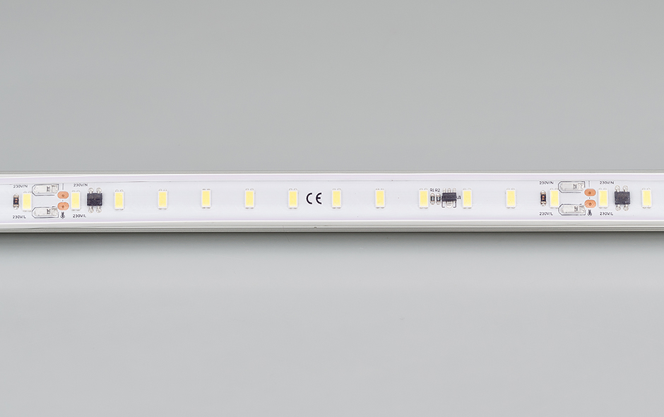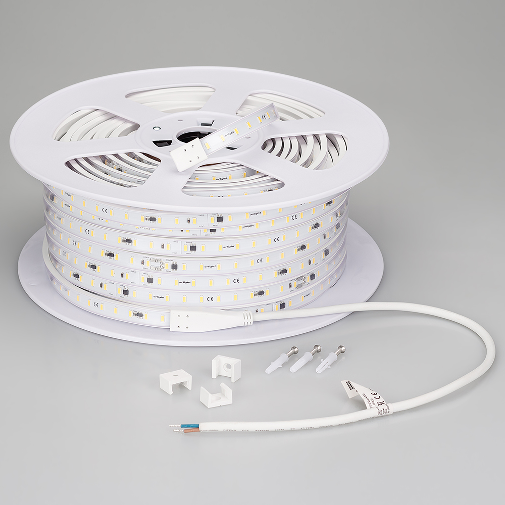 Герметичная IP65 (в PVC трубке, тип 1) лента AC230V. Cветодиоды smd 5630, 72 шт/м (3600 шт на 50м), без скотча, крепление на скобы (в комплекте). Цвет ТЁПЛЫЙ 2900-3200K.Питание 230V, мощность 14 Вт/м (700 Вт на 50м), угол 120°, цветопередача CRI>80. Размеры 50000х15.5x6 мм. Мин.отрезок 500мм, 36шт светодиодов. Провод питания с одной стороны. Катушка 50м. Цена за 1м.