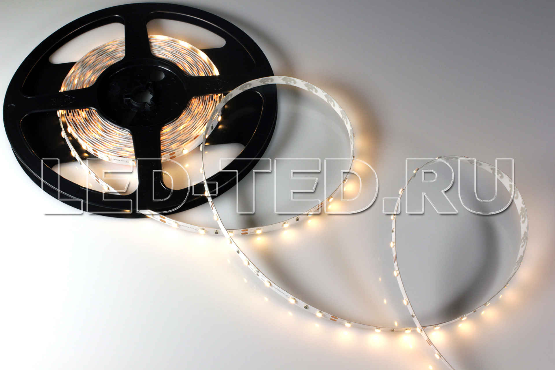 Светодиодные ленты. Светодиодная лента RT-A60, открытая. Светодиоды 2835, 60 шт/м (300 шт на 5 м), белая плата, ширина 8 мм, скотч 3M. Цвет ТЁПЛЫЙ 3000 K, цветопередача CRI>85, угол 120°. Питание 12V, мощность 4.8 Вт/м (24 Вт на 5 м). Размеры 5000x8x1.8 мм. Мин. отрезок 50 мм, 3 светодиода. Цена за 1 м.