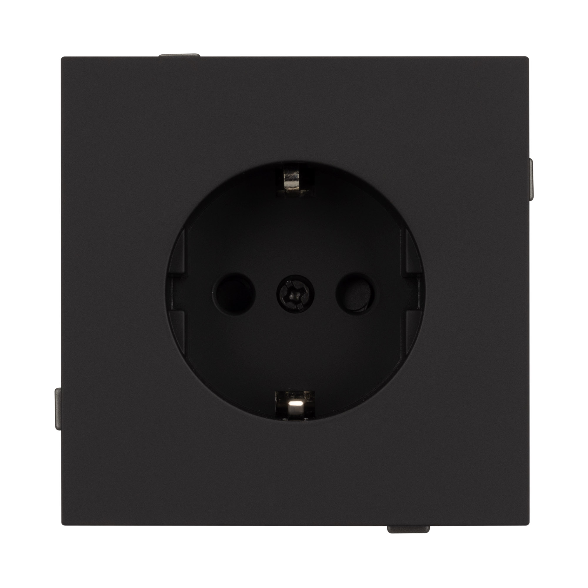 Механизм розетки с заземлением на 1 пост. Цвет - черный, с Soft-Touch покрытием. Без фронтальной рамки. Уровень пылевлагозащиты IP20. Розетка устанавливается в стандартный подрозетник круглого сечения диаметром 60мм.
