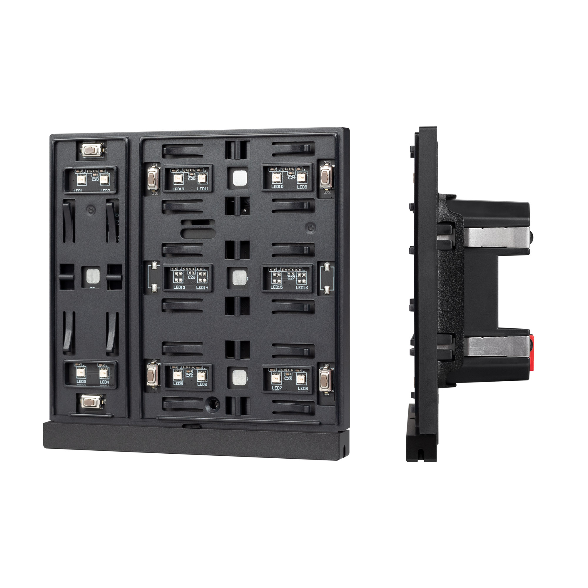 Механизм универсальной многофункциональной встраиваемой настенной панели для систем KNX. 3 клавиши, светодиодная индикация. Наличие функции KNX Secure. Безрамочный корпус черного цвета, материал - пластик, светодиодная индикация (настраиваемая RGB палитра индикации). В механизме панели предусмотрено 2 дополнительных бинарных входа для подключения датчиков температуры NTC или выключателей. Питание от шины KNX DC 21-30V. Габариты 86x86x33 мм.