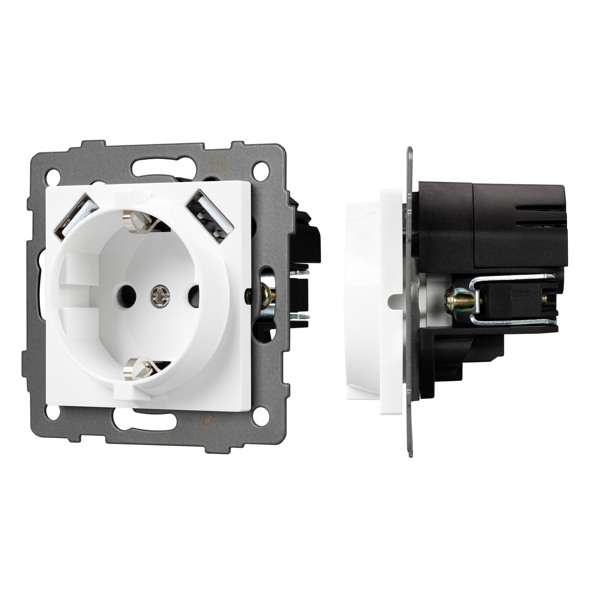 Механизм розетки с заземлением 1 пост 2 USB Type A+C порта. Цвет - белый. Без фронтальной рамки. Уровень пылевлагозащиты IP20. Устанавливается в стандартный подрозетник.