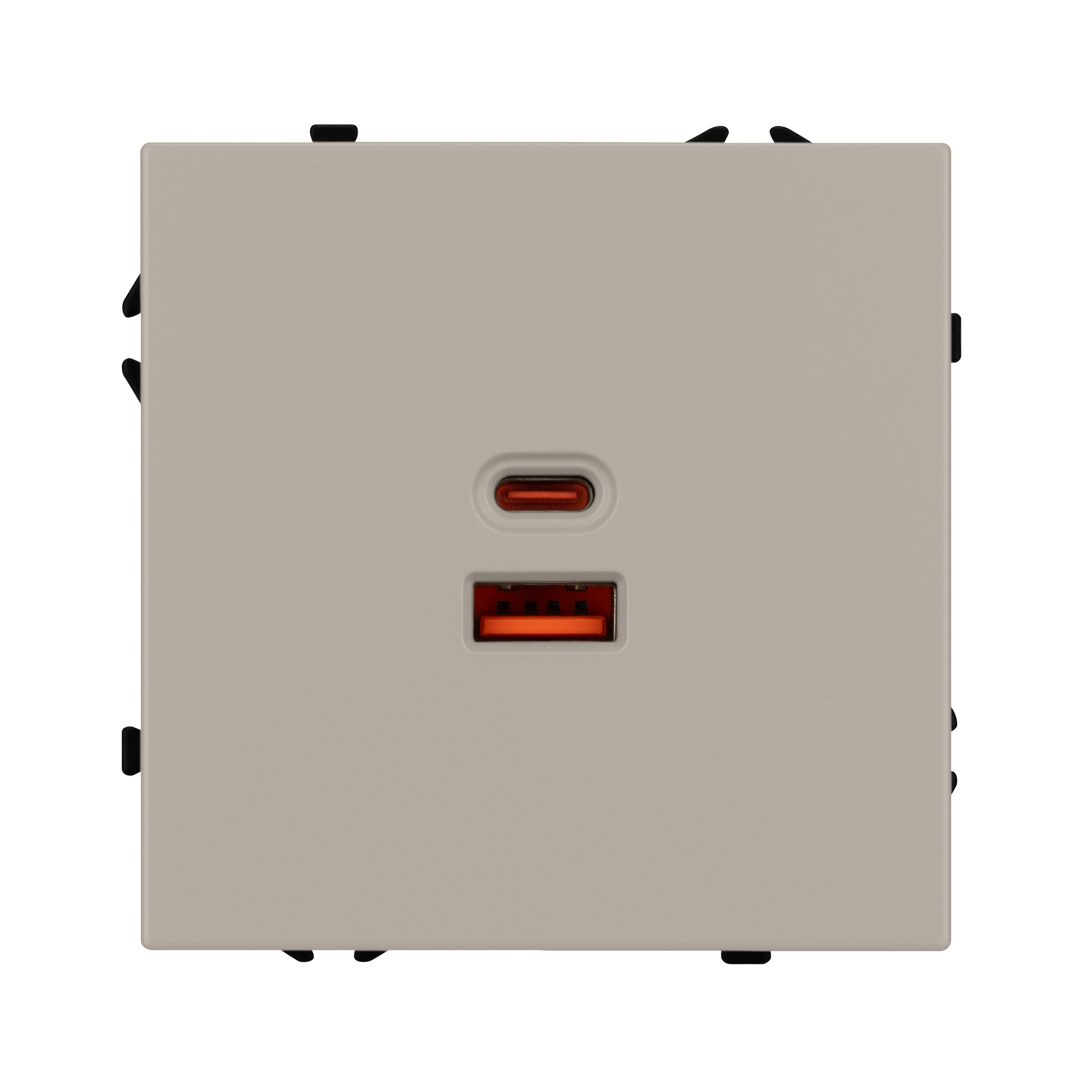 Механизм розетки с быстрой USB зарядкой на 2 порта. Цвет - кашемир, с Soft-Touch поверхностью. Без фронтальной рамки. Уровень пылевлагозащиты IP20. Тип подключаемого разъема - USB Type A + Type C. Устанавливается в стандартный подрозетник круглого сечения диаметром 60мм.