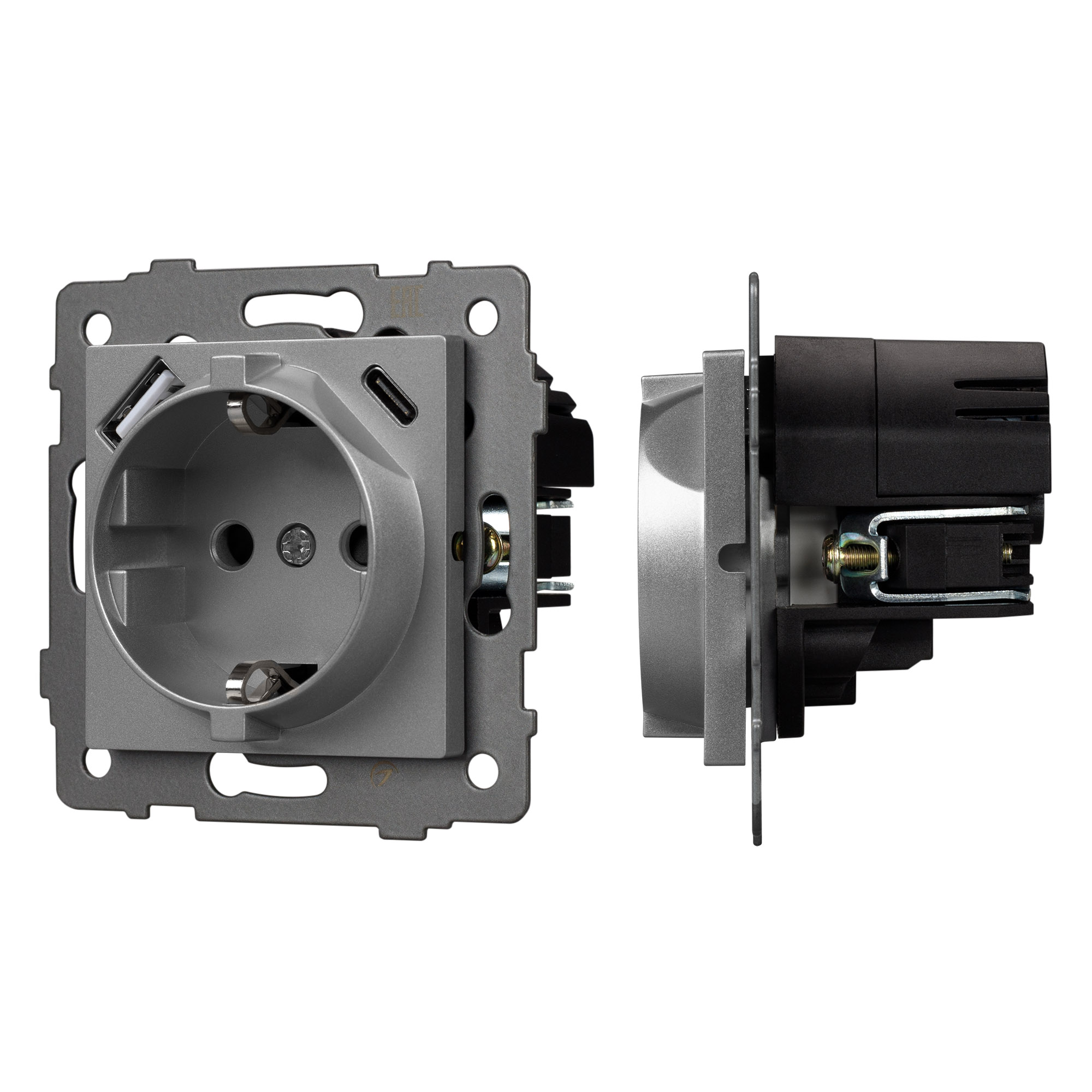 Механизм розетки с заземлением 1 пост 2 USB Type A+C порта. Цвет - серый. Без фронтальной рамки. Уровень пылевлагозащиты IP20. Устанавливается в стандартный подрозетник.