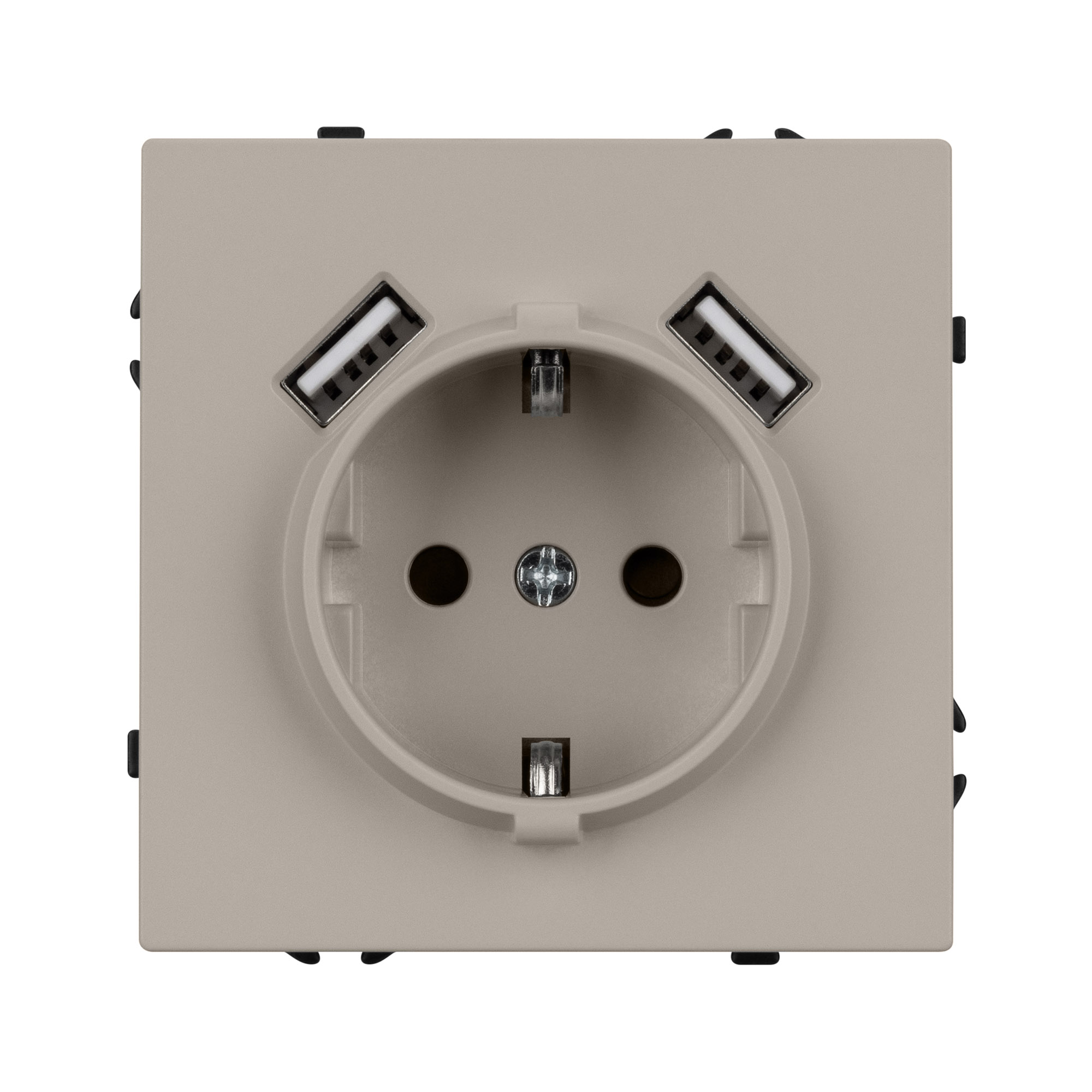Механизм розетки с заземлением на 1 пост и 2USB Type A порта. Цвет - кашемир, с Soft-Touch поверхностью. Без фронтальной рамки. Уровень пылевлагозащиты IP20. Розетка устанавливается в стандартный подрозетник круглого сечения диаметром 60мм.