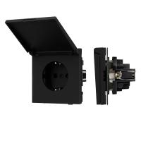 Механизм розетки с заземлением и влагозащитной крышкой на 1 пост. Цвет - черный, с Soft-Touch покрытием. Без фронтальной рамки. Уровень пылевлагозащиты IP44. Розетка устанавливается в стандартный подрозетник круглого сечения диаметром 60мм.