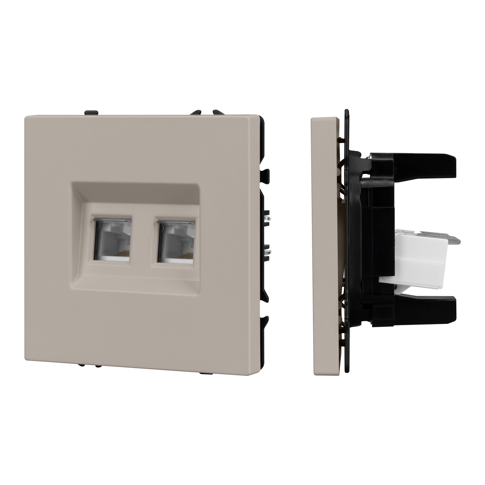 Механизм компьютерной розетки на 2 поста 6-й категории. Цвет - кашемир, с Soft-Touch поверхностью. Без фронтальной рамки. Уровень пылевлагозащиты IP20. Тип подключаемого разъема - RJ45. Розетка устанавливается в стандартный подрозетник круглого сечения диаметром 60мм.