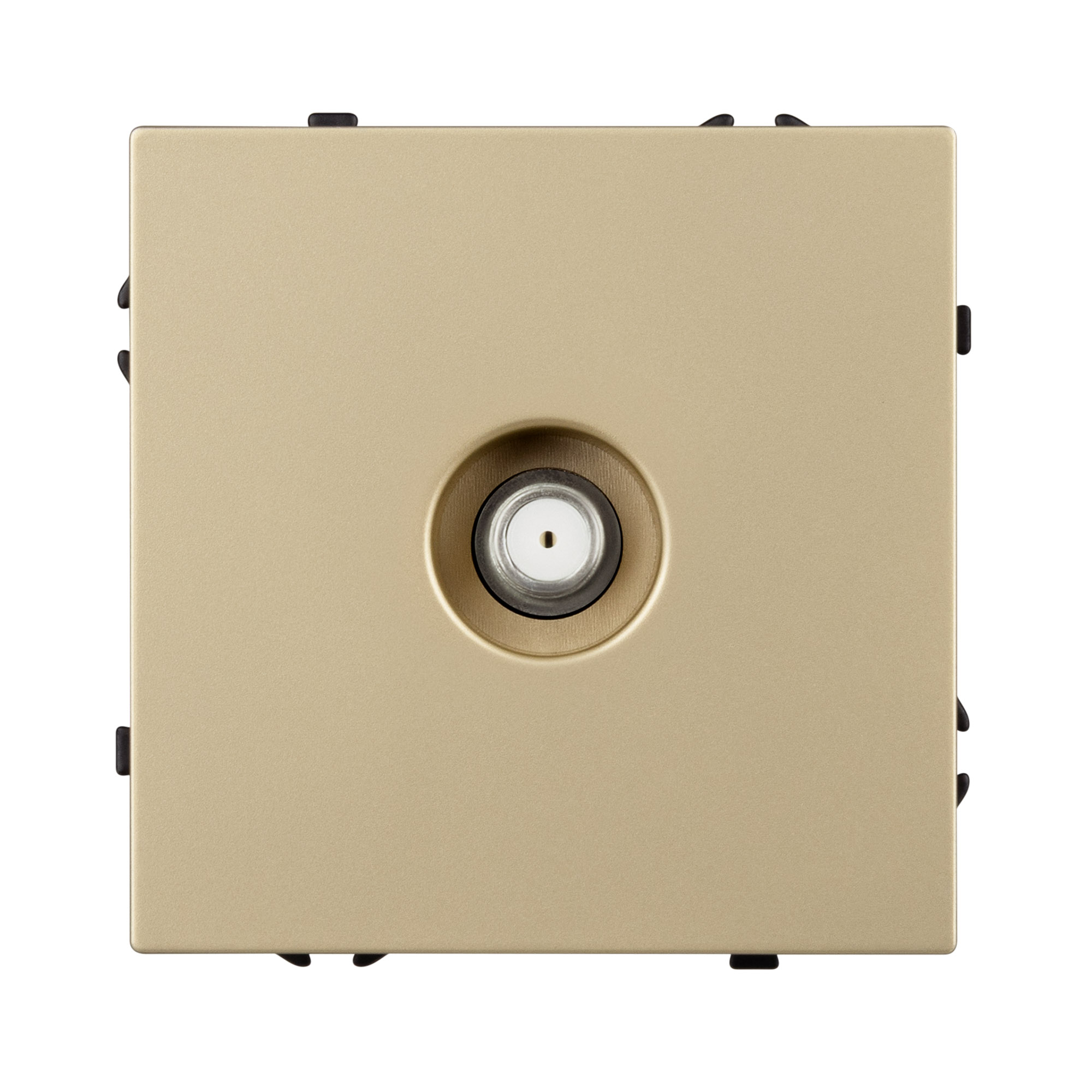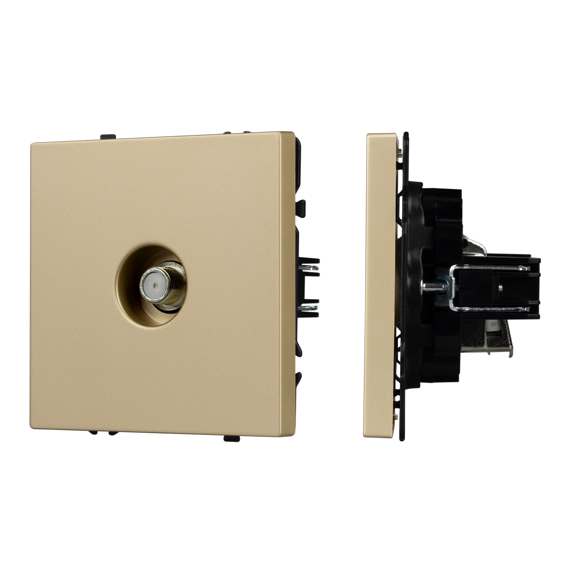 Механизм розетки для подключения спутниковой антенны на 1 пост. Цвет - золотой песок, с Soft-Touch покрытием. Без фронтальной рамки. Уровень пылевлагозащиты IP20.