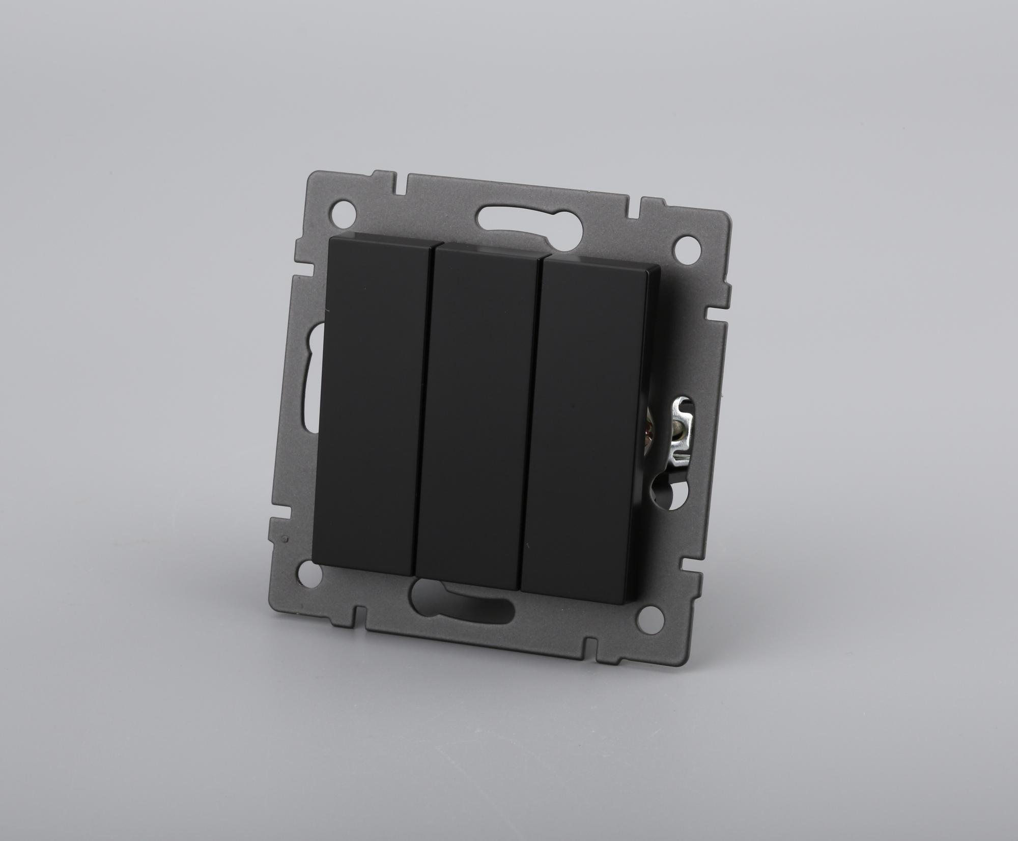 Механизм выключателя света клавишный на 1 пост 3 клавиши (непроходной). Цвет - черный. Без фронтальной рамки. Уровень пылевлагозащиты IP20. Выключатель устанавливается в стандартный круглый подрозетник.