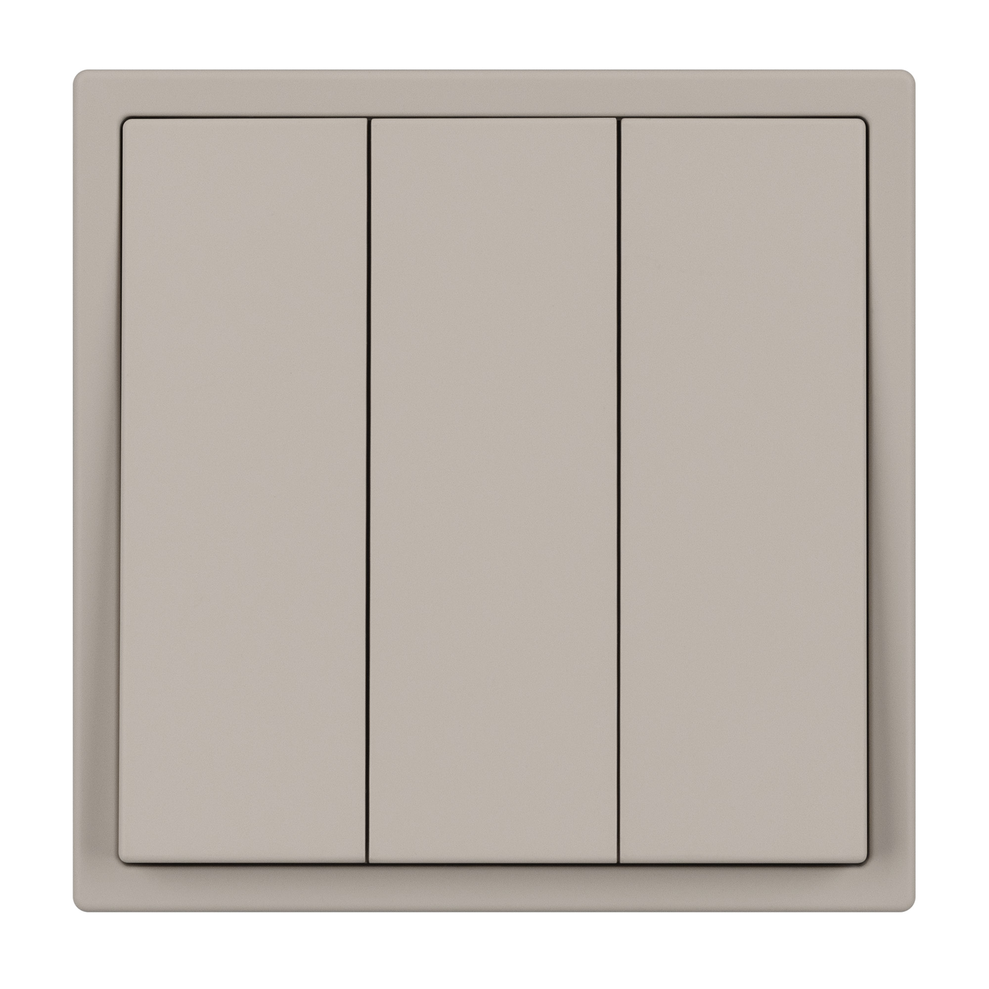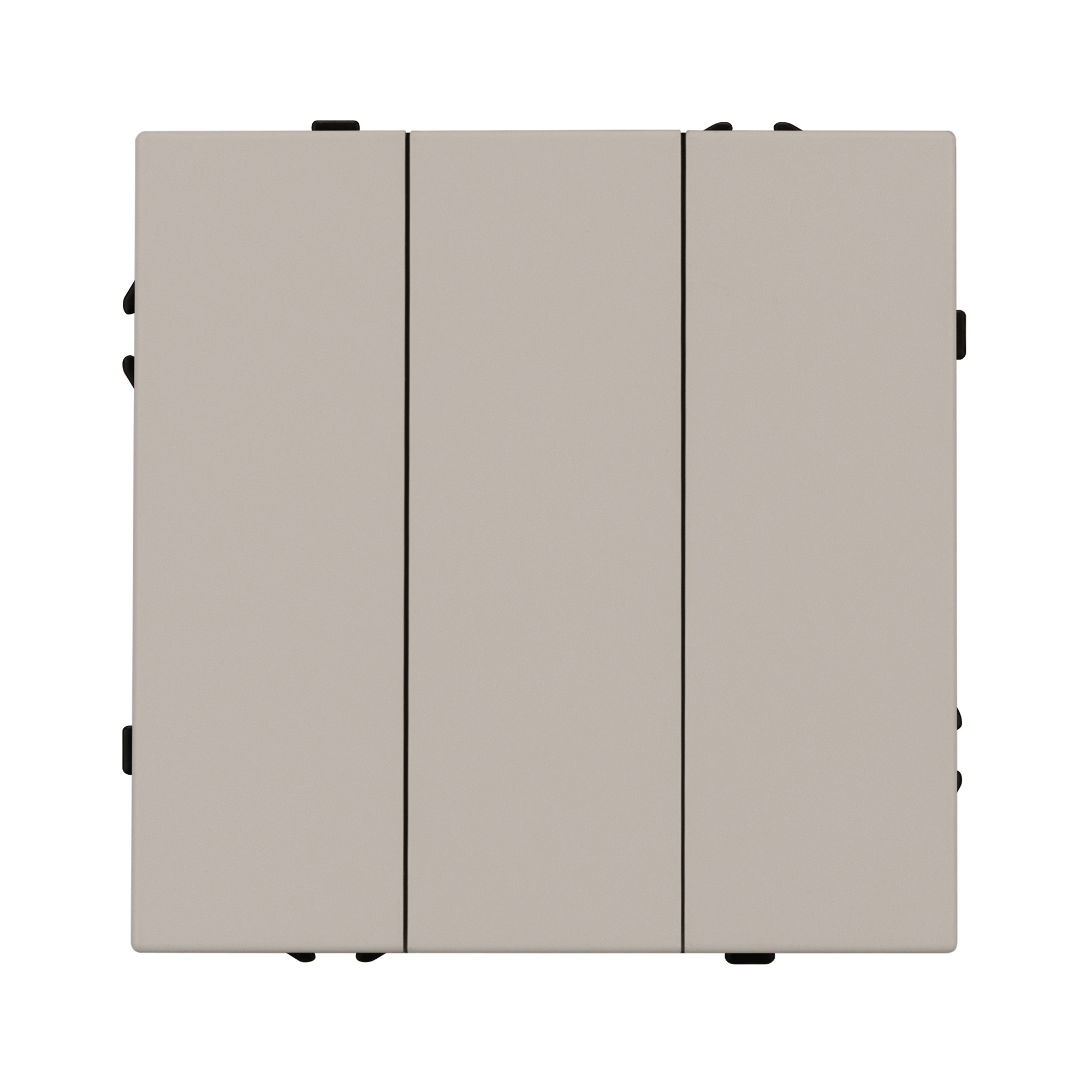 Механизм выключателя света клавишный на 1 пост 3 клавиши (непроходной). Цвет - кашемир, с Soft-Touch поверхностью. Без фронтальной рамки. Уровень пылевлагозащиты IP20. Выключатель устанавливается в стандартный круглый подрозетник круглого сечения диаметром 60мм.