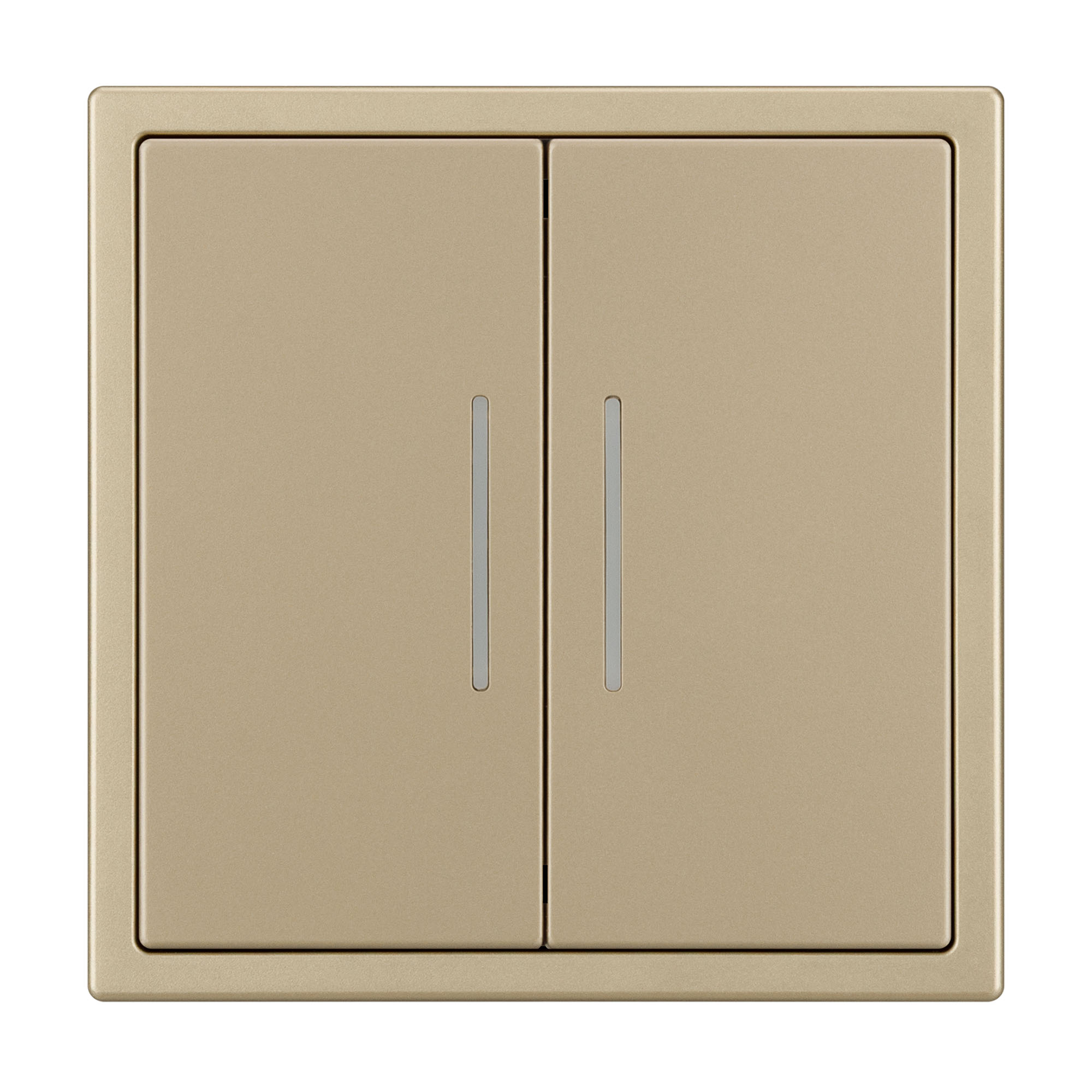 Механизм звонкового выключателя двухклавишный на 1 пост 2 самовозвратные клавиши. Цвет - золотой песок, с Soft-Touch покрытием. Клавиша имеют LED подсветку - cинего свечения. Без фронтальной рамки. Уровень пылевлагозащиты IP20. Выключатель устанавливается в стандартный круглый подрозетник круглого сечения диаметром 60мм.
