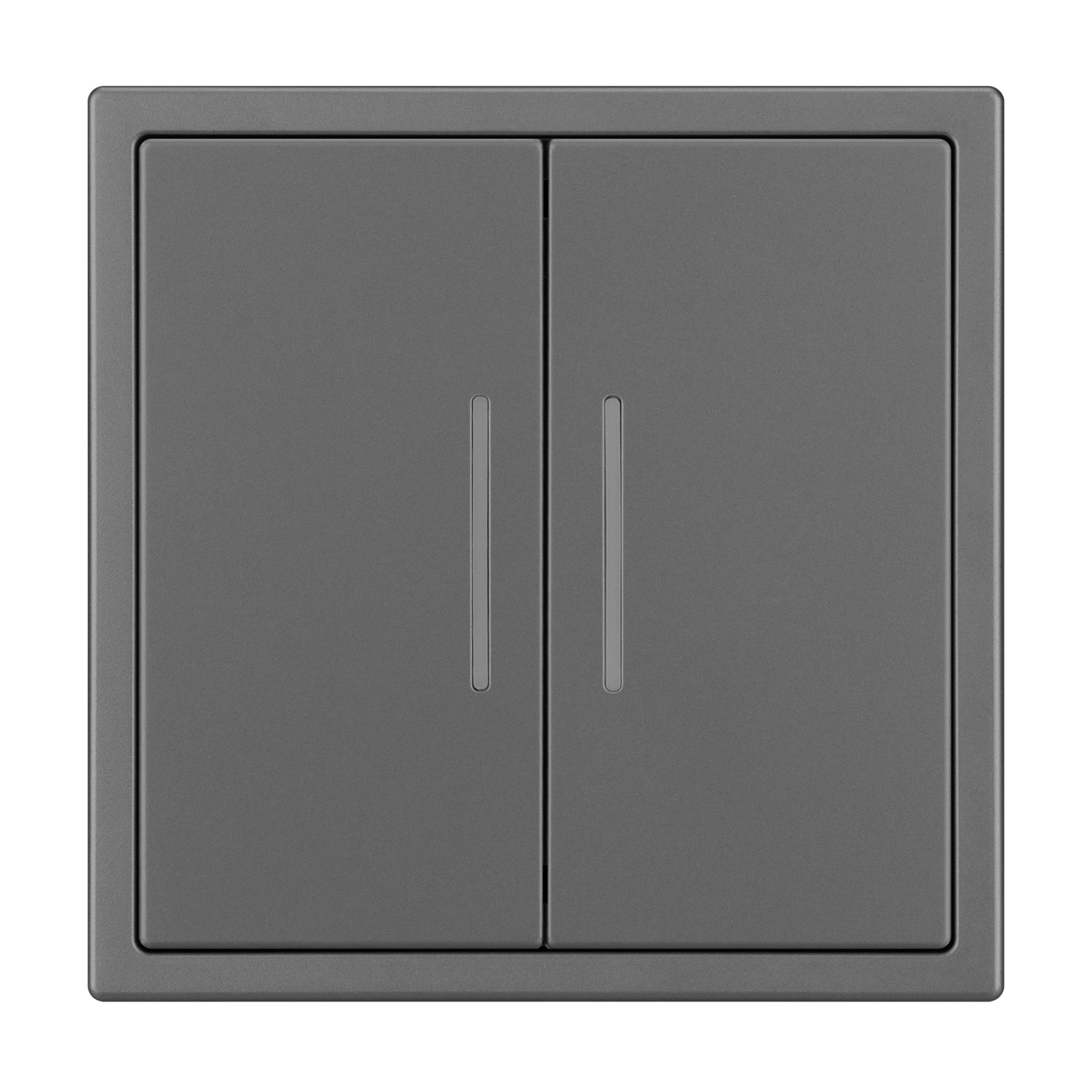 Механизм звонкового выключателя двухклавишный на 1 пост 2 самовозвратные клавиши. Цвет - серый базальт, с Soft-Touch покрытием. Клавиша имеют LED подсветку - cинего свечения. Без фронтальной рамки. Уровень пылевлагозащиты IP20. Выключатель устанавливается в стандартный круглый подрозетник круглого сечения диаметром 60мм.