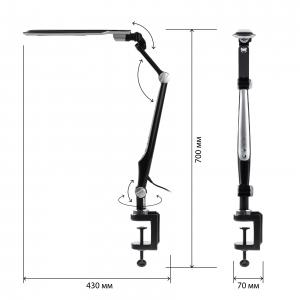 Функциональные преимущества Светильник со светодиодами (LED) в качестве источников света. Выбор цветовой температуры - 3 цвета: 3000К, 4500К, 6000К. Сенсорное переключение. Плавный диммер для регулировки яркости. Светильник сохраняет выбранные настройки при включении-выключении. Высота плафона регулируется двухсекционной сгибающейся стойкой, направление света регулируется поворотом и наклоном плафона в любую сторону. Модель на струбцине.