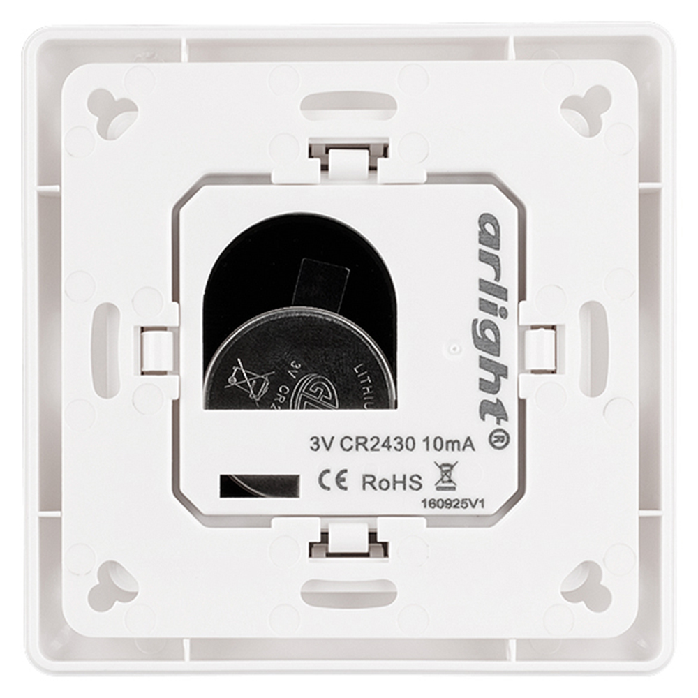 4-зонный накладной диммер-выключатель, работает по радиоканалу (короткое нажатие - вкл, длинное нажатие - диммир-е). Используется с контроллерами серии SR-1009х. Питание - литиевая батарейка 3V CR2430. К одному контроллеру SR-1009х можно привязать неск. панелей.
