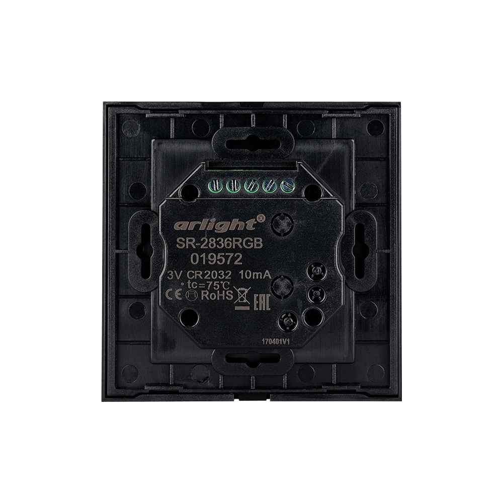 Встраиваемая в стену поворотная черная панель для с/д RGB-лент. Цвет черный. Управление по радиоканалу. Питание - 3V батарея CR2032. Работает вместе с контроллером SR-1009x. Размер 86х86х45 мм