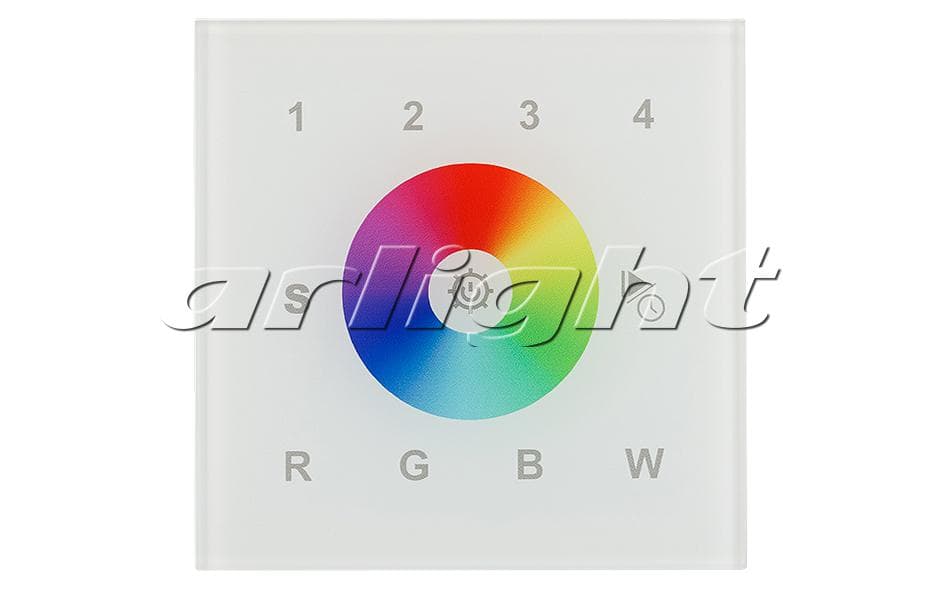Настенная встраиваемая стеклянная панель белого цвета с сенсорным управлением (сенсорное кольцо и 11 сенсорных кнопок) для мультицветных светодиодных RGBW-лент. 4 зоны управления, 1 слот памяти пользовательских настроек. Питание по шине DALI. Система команд DT8: до 64 устройств (DALI-DT8), при адресации DT8 4 канала (RGBW) на 1 адрес.